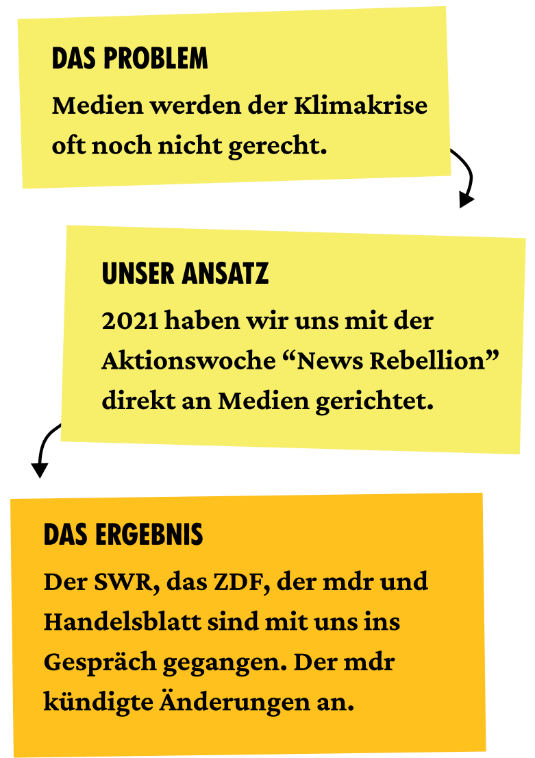 Für deutschlandweite Aktionen fokussieren wir uns gemeinsam auf einen Zeitraum und kommen an einem Ort zusammen. Manchmal nennen wir das eine “Rebellion Wave”, da solche Termine gerne international von einem Land ins nächste laufen.