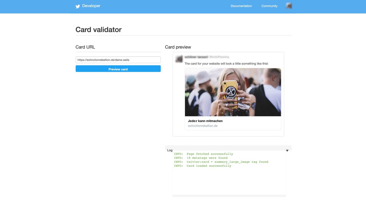 Pro-Tipp: Wenn dein Vorschaubild auf Twitter nicht lädt, kannst du Twitter mit dem Card Validator "anstupsen", das Bild zu laden. Einfach den entsprechenden Link einfügen und auf "preview card" klicken. Du musst dafür allerdings auf Twitter eingeloggt sein!