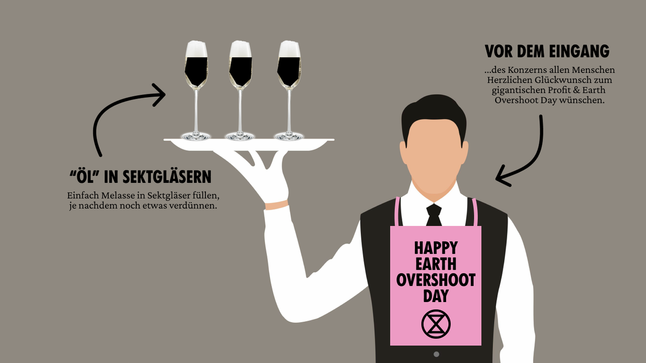 Fein gekleidet und mit Sektgläsern voller Öl stellen wir uns vor die Zentralen & Büros der Klimakiller in der Gegend. Genügend davon gibt es ja: Von Wintershall & deren Mutterkonzern BASF bis hin zu RWE, HeidelbergCement und VW. Wir wollen den Konzernen zeigen, dass wir sie im Blick behalten und medienwirksam verbreiten, wer von der Ausbeutung profitiert.