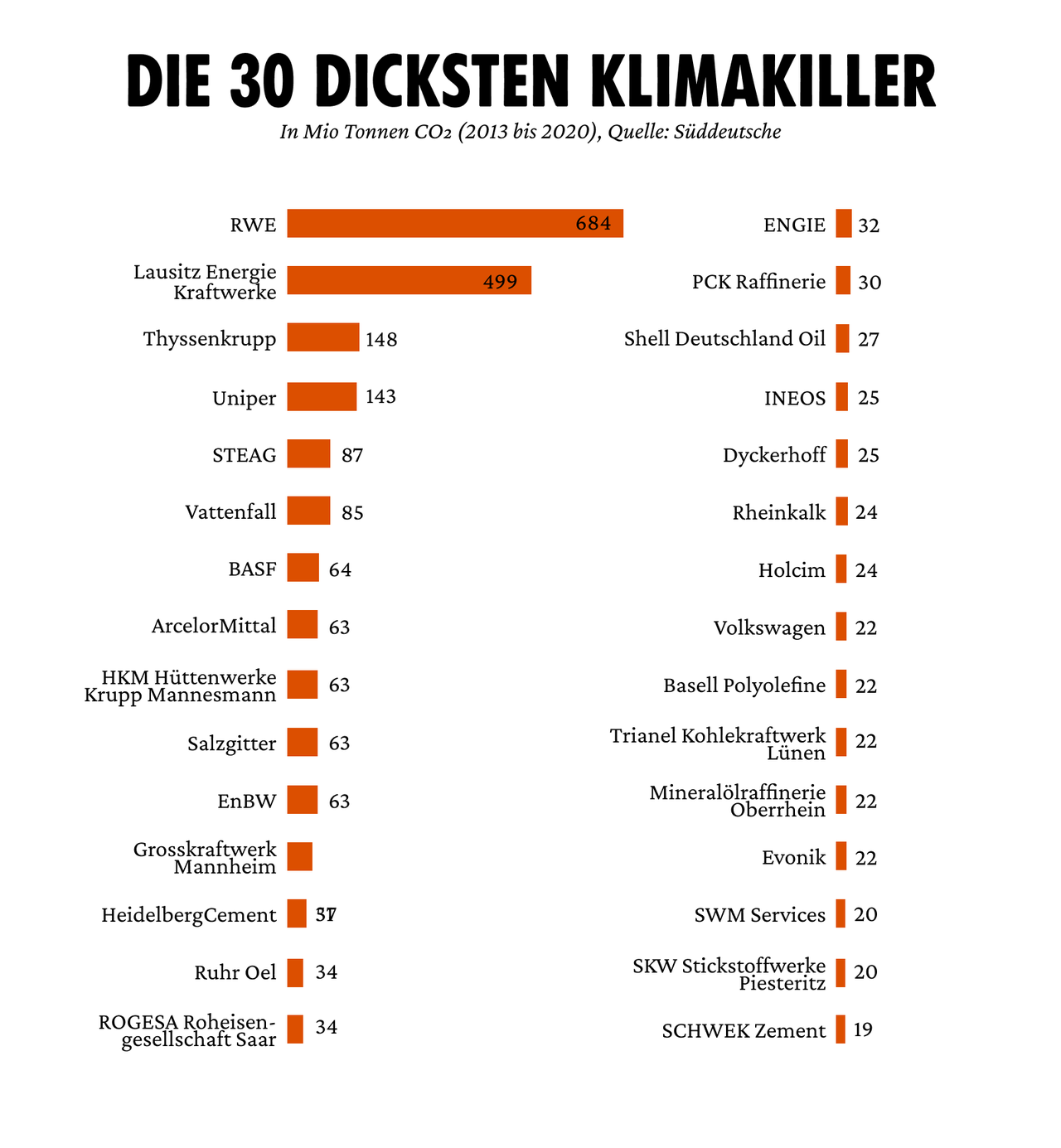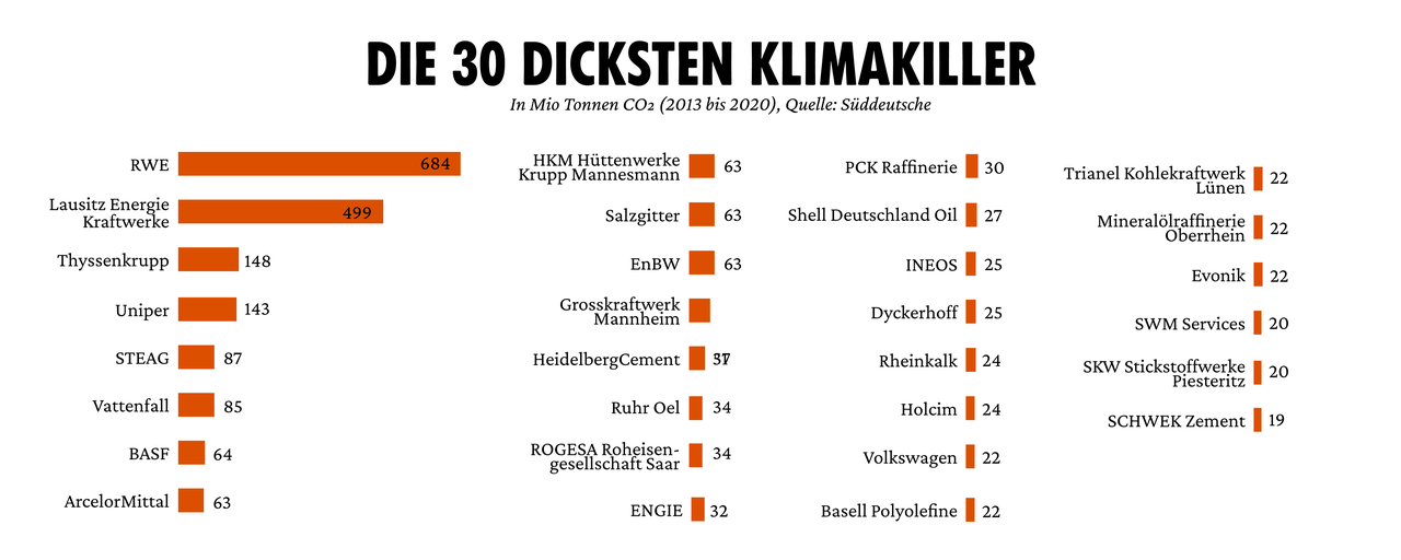 Denn, was viele nach wie vor nicht wissen: Nur 30 Konzerne sind für ein ganzes Drittel der Emissionen in Deutschland verantwortlich! Und viele von denen sitzen direkt um die Ecke. Wer hätte gedacht, dass Zement so schlimm ist oder die netten Stadtwerke von nebenan für so massivst viel CO₂ verantwortlich sind?