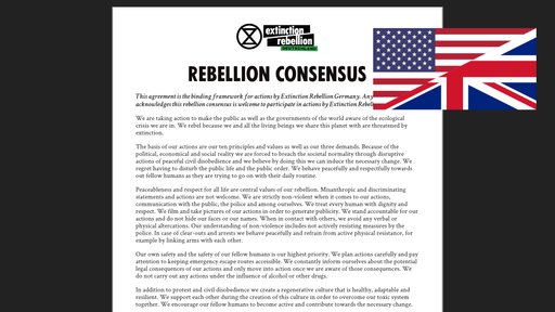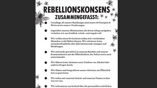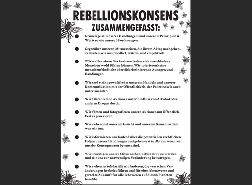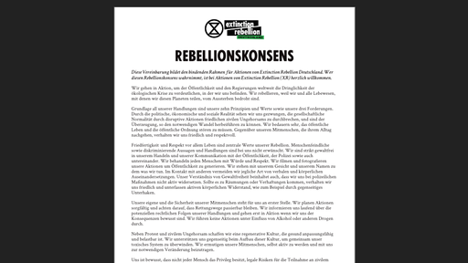 Diese Vereinbarung bildet den bindenden Rahmen für Aktionen von Extinction Rebellion Deutschland. Wer diesen Rebellionskonsens wahrnimmt, ist bei Aktionen von Extinction Rebellion (XR) herzlich willkommen.