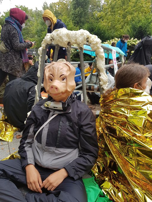 Am Deutschen Bauernverband hat sich gegen 09:00 Uhr Animal Rebellion eingerichtet. Kletter:inen sitzen auf dem Vordach und an den Fenstern. Vor dem Eingang ist ein Kastenstand platziert – ein höchst umstrittenes Bauwerk aus der Sauenhaltung, das die Bewegungsfreiheit des Tieres auf wenige Schritte beschränkt. Der Kasten steht mahnend für die Reformunwilligkeit, die in weiten Teilen des industrialisierten Agrarsektors herrscht und durch den Bauernverband in die Politik getragen wird. Am Kasten haben sich Menschen mit massiven Fahrradschlössern angekettet, später wird eine Teilnehmerin in den Kasten steigen um zu verdeutlichen, wie beengt es darin ist.