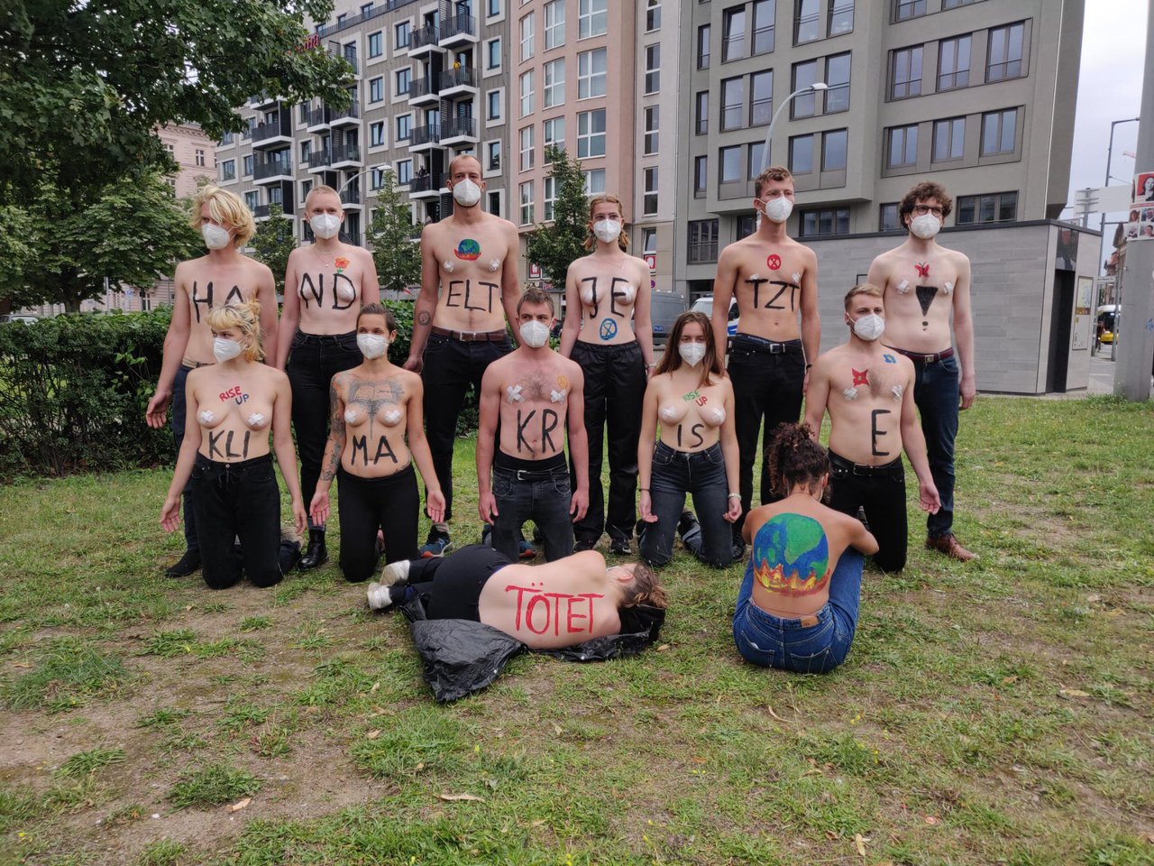 Auf dem Weg begegnen uns kleine Aktionen wie diese Oberkörper-freien Aktivist:innen. Auf Bauch und Brust geschriebene Buchstaben ergeben die Sätze „Handelt Jetzt! Klimakrise tötet“. Unterdessen richtet XR Polen am U-Bahnhof Naturkundemuseum gegen 18:00 Uhr eine kleine Sitzblockade mit Lock-Ons und Glue-Ons ein.