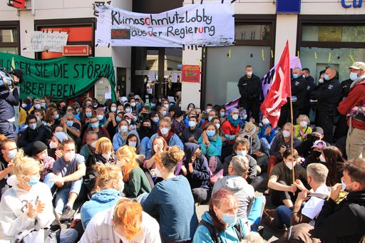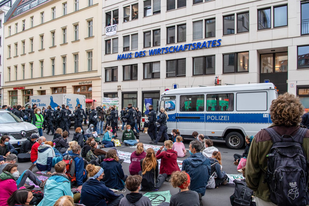 Um 09:00 Uhr stellt sich eine Aktivistin als Mitglied der Jungen Union beim Wirtschaftsrat der CDU für ein Interview vor und bringt direkt ein paar Kolleg:innen zur Unterstützung mit. Ausgestattet mit Livestream-Equipment und einer extra Portion Gel in den Haaren geht es in den dritten Stock und in ein Büro Richtung Straße. An der Fensterbank kleben sich die Aktivist:innen an, öffnen die Fenster und hängen ein Banner mit der Aufschrift „besetzt“ heraus. Den Mitarbeiter:innen des Wirtschaftsrates erklären sie die Situation und entschuldigen sich für die ungewöhnliche Störung. Vor dem Eingang versammeln sich etwa 30 und auf der Straße etwa 50 Aktivist:innen in einer Sitzblockade aber weil die Polizei sofort zur Stelle ist können Gerätschaften nicht aufgebaut werden. Am Eingang haben sich Aktivist:innen angeklebt.
