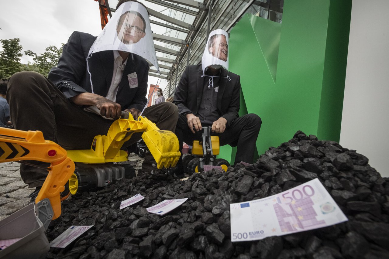 Kleine Bagger stehen an einem Haufen Kohle. Die Bagger bedienen Aktivist:innen mit Masken auf denen Armin Laschet und Andreas Scheuer abgebildet sind. Diese beiden Persönlichkeiten sind sehr gut mit den fossilen Industrien vernetzt, wie etwa der Braunkohle- & Automobilindustrie.