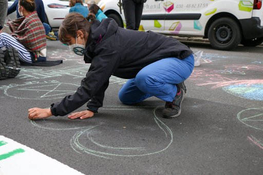 Hier ein kurzer Kommentar zur Aktion. In einer etwas später veröffentlichten Pressemitteilung des Wirtschaftsrates werden direkt mehrere Unwahrheiten aufgestellt – die friedlichen Demonstranten werden als Extremisten bezeichnet, Zufahrtswege der Charité seien durch die Blockade behindert – einen Umstand den die Charité auf Nachfrage nicht bestätigen kann – und die Genehmigung der Demo wird auf den rot-rot-grünen Senat geschoben, während es sich hier um normales Versammlungsrecht handelt. Einstecken scheint der Wirtschaftsrat jedenfalls nur in die eigenen Taschen zu können und die Contenance zu bewahren war auch für Friedrich Merz keine Option. Aktivist:innen vor dem Gebäude nutzen die ruhige Atmosphäre um mit Kreide etwa Vorschläge für die Mittagspause zu hinterlassen: „Change your diet, not the climate“.