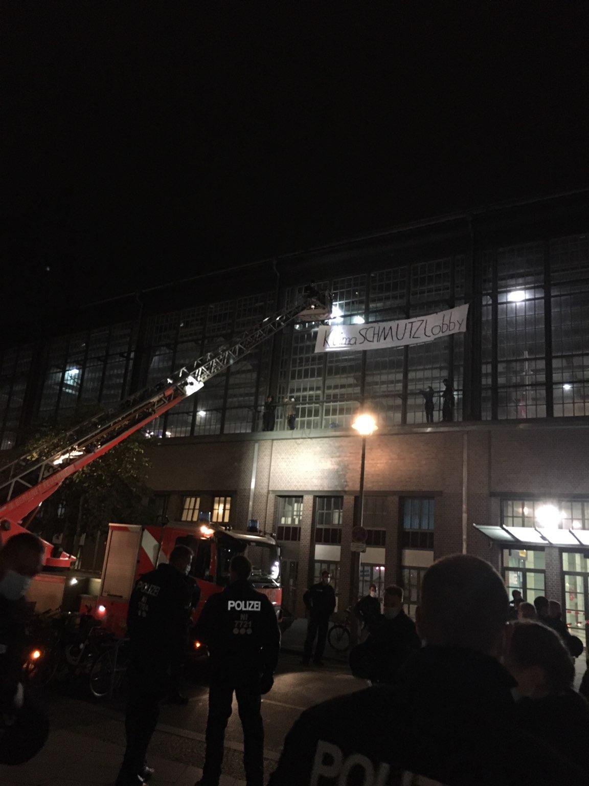 Um 21:45 Uhr erklettern drei Aktivist:innen die Südseite des Bahnhofs Friedrichstraße um dort einen etwa 8m breiten Banner mit der Aufschrift „Klimaschmutzlobby“ gegenüber der Initiative Neuer Sozialer Marktwirtschaft (INSM) aufzuhängen. Die Polizei ist sehr schnell mit einer Hebebühne und Kletter-Einheit vor Ort. Unterstützer:innen an der Straßenseite werden kurzerhand in Handschellen mitgenommen und dann wieder freigelassen.