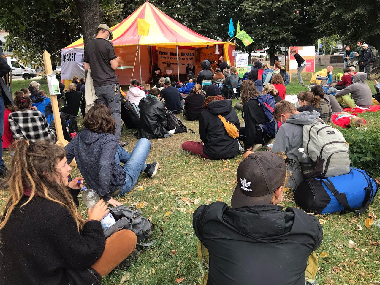 Um 13:30 Uhr sitzen vor der NRW Landesvertretung etwa 50 Aktivist:innen und neun sind auf das Vordach gestiegen.