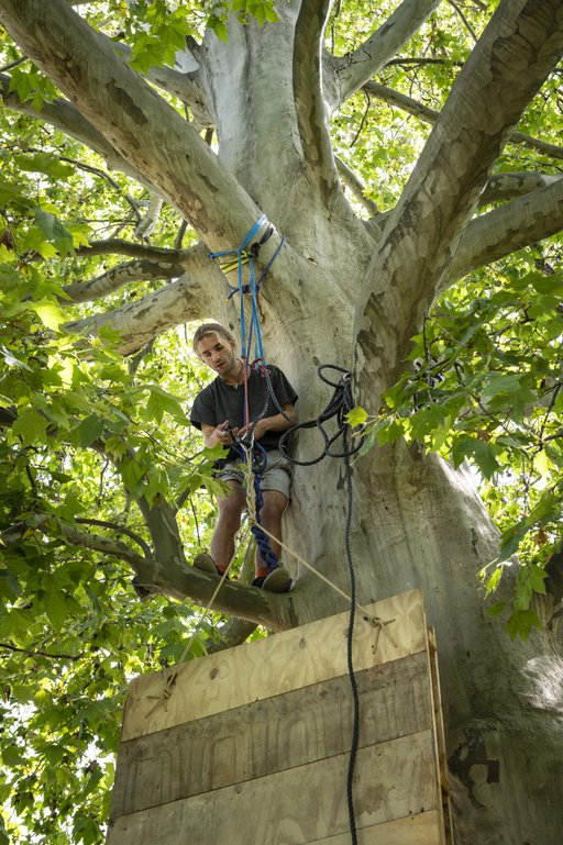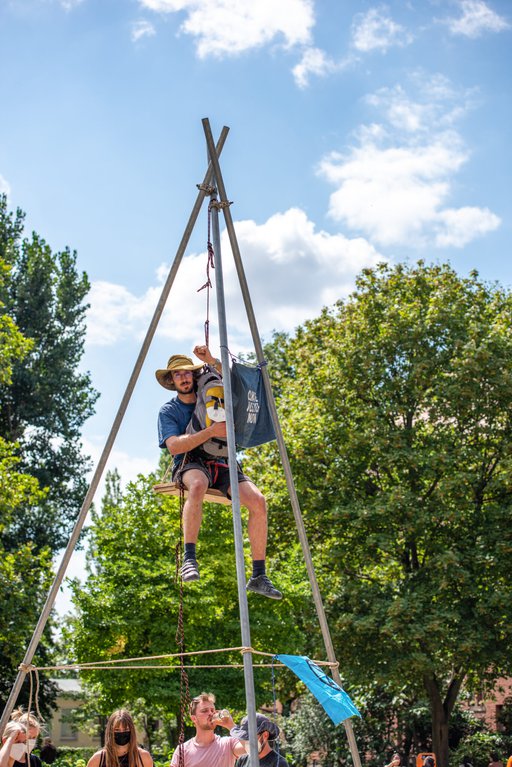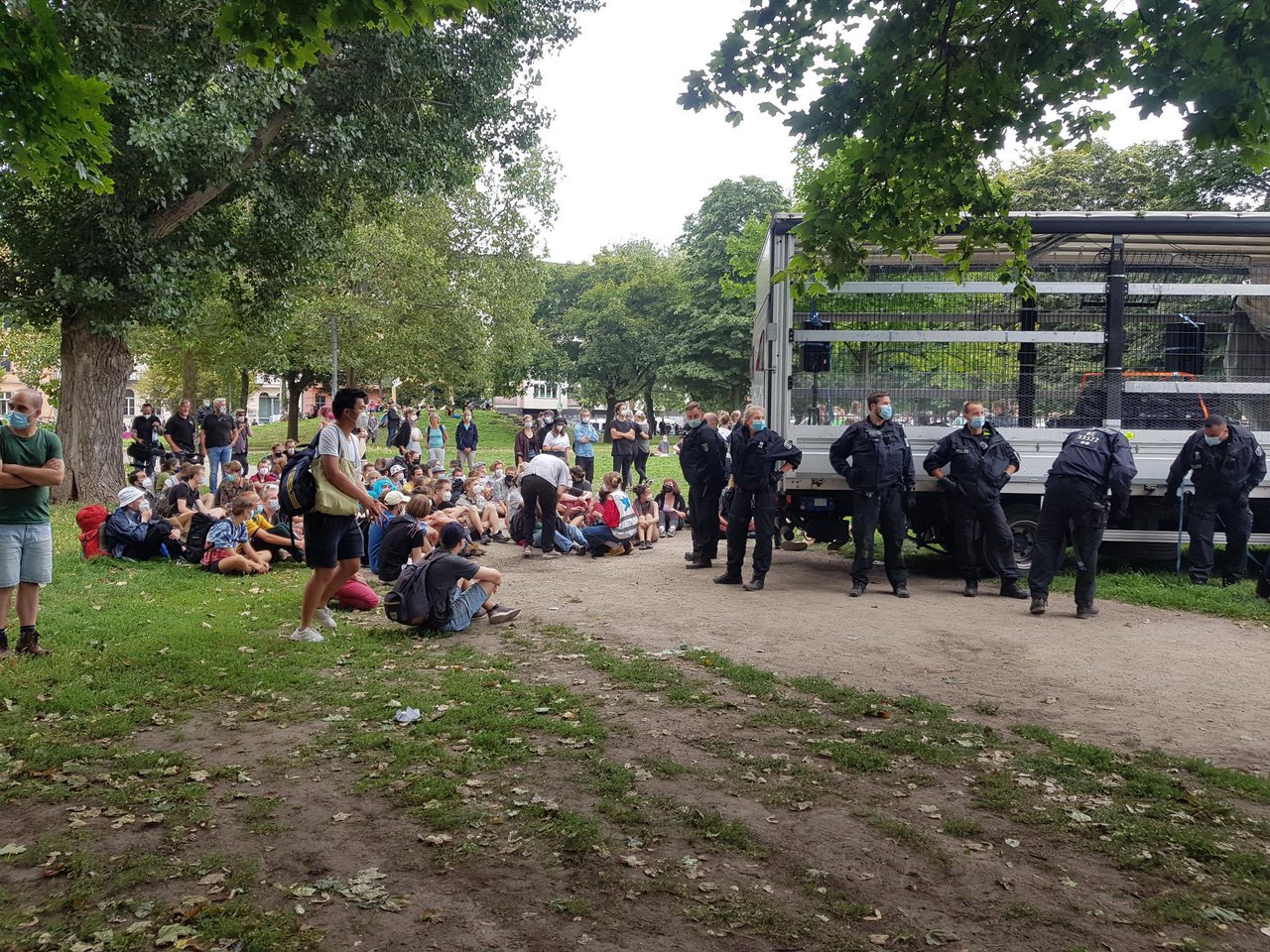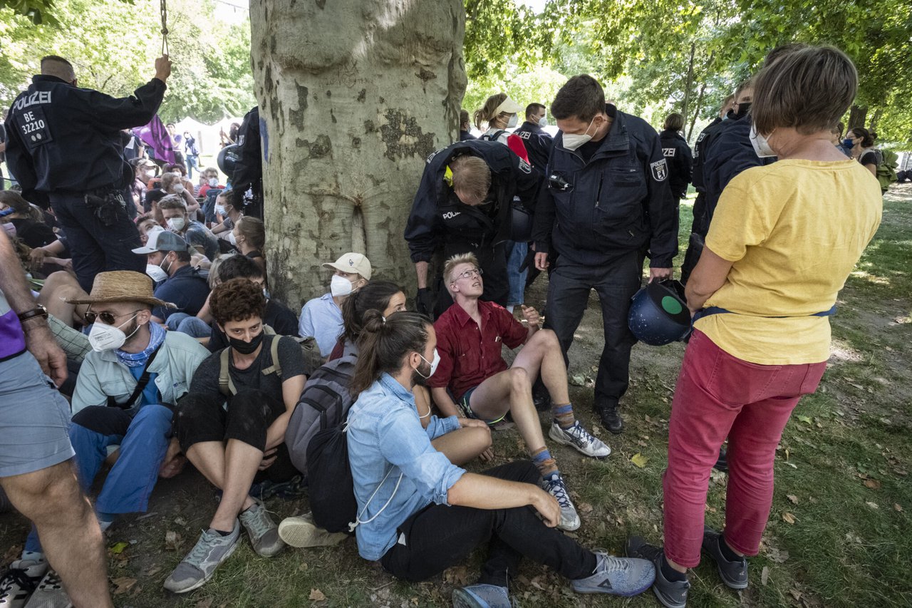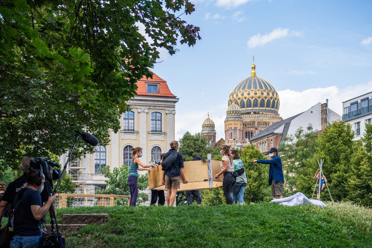 Im Park haben Tripods und Kletterer neben kreativen Kunst-Installationen und friedlichen Aktivist:innen einen Platz gefunden. Die inzwischen massive Polizeipräsenz im Park wirkt absurd, auf der Oranienburger Straße zieht sich eine lange Schlange Einsatzwagen.