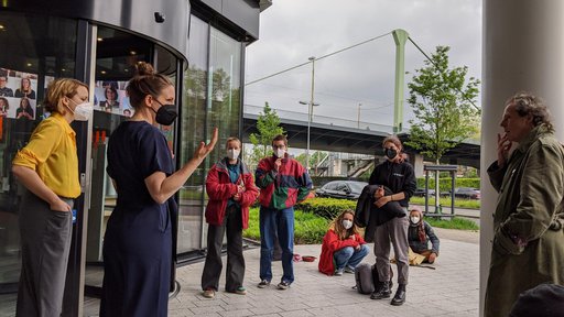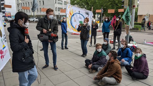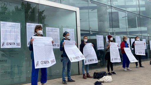 Nach einer Demonstration gegen die Kriminalisierung der Klimagerechtigkeitsbewegung vor dem Westdeutschen Rundfunk (WDR) fahren Rebell:innen spontan zum Zweiten Deutschen Fernsehen (ZDF), die Studioleiterin ist bereit ins Gespräch zu gehen. Hier ein Eindruck! Danach sprechen sie mit dem Handelsblatt (Leiterin Journalismus Live und Energieredakteurin) über die Berichterstattung zur Klimakrise.