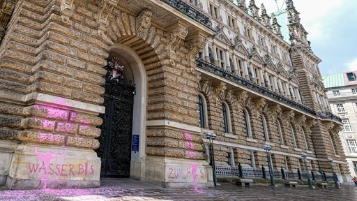 Das Rathaus wurde mit mehreren Litern pinker Farbe versehen – “Der Senat spielt den Notfall herunter. Es ist jetzt an uns, auf die unbequeme Realität zu schauen und Alarm zu schlagen.” sagt Aktivist Henning.
