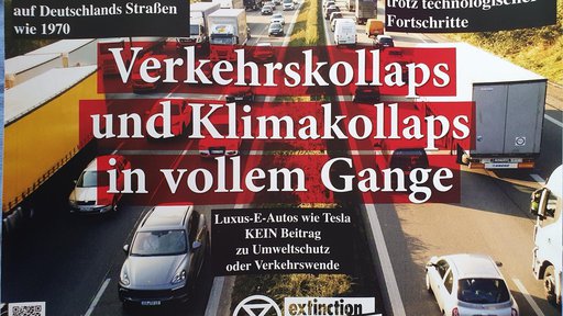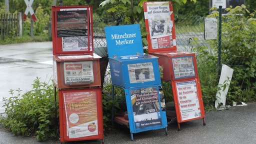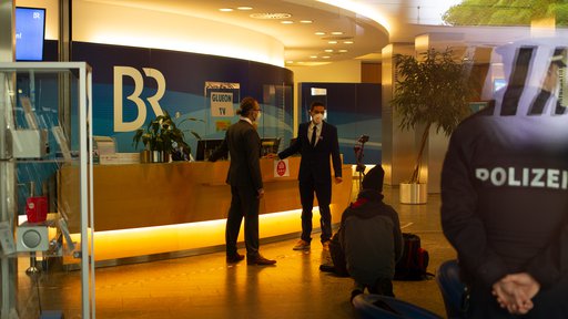 Weist mit Schlagzeilen auf Zeitungskästen auf die Klimakrise hin und hat sich vor den Bayerischen Rundfunk (BR) gesetzt. Zwei Aktivist:innen kleben außerdem am Tresen im Eingangsfoyer.