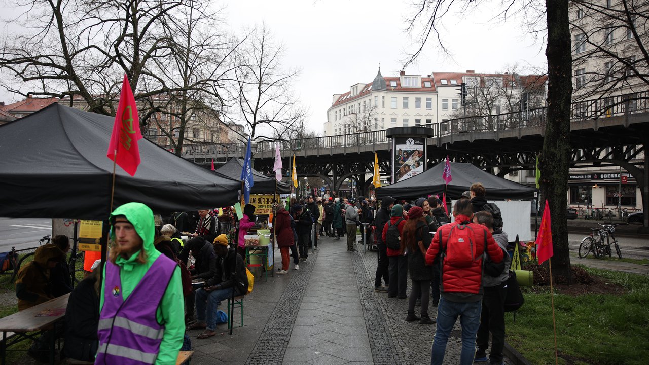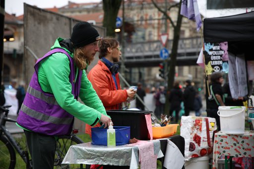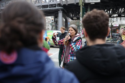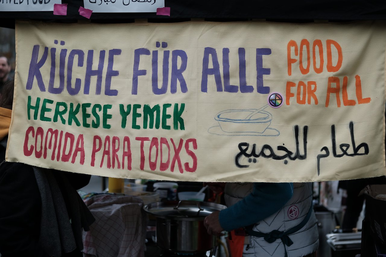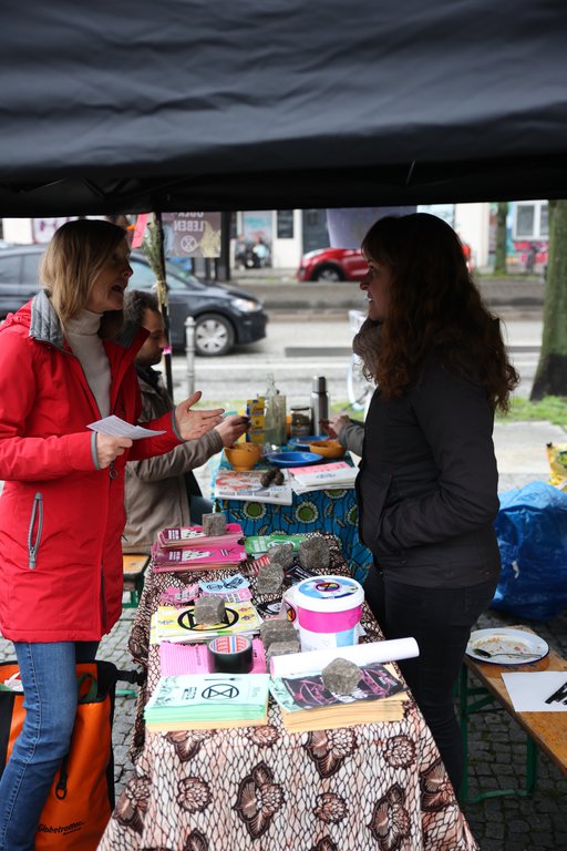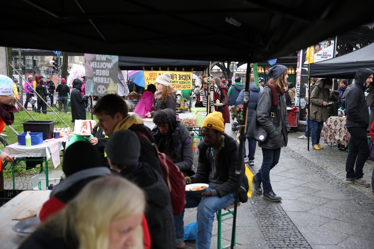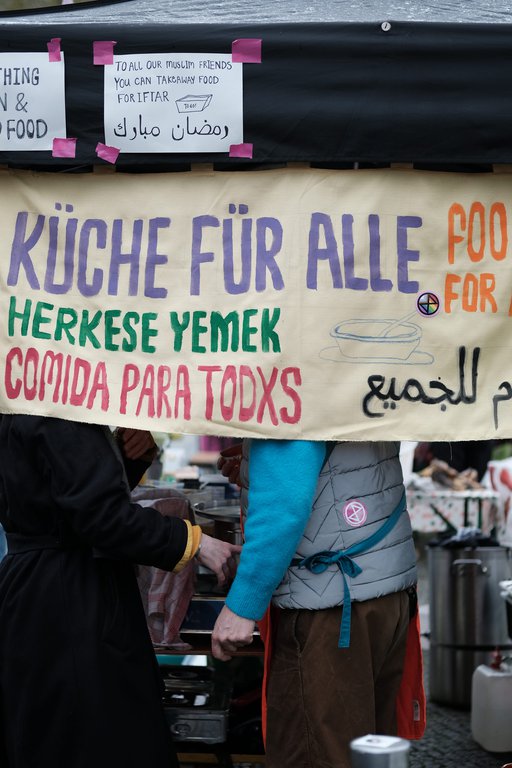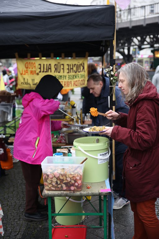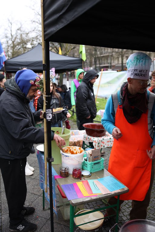 In der Küche für alle, kurz "Küfa", die wir am Schlesischen Tor aufgebaut haben, geht es daher nicht nur um Ernährung und Biodiversität sondern auch Gemeinschaft. Anwohner:innen und Durchreisende werden eingeladen auf einen veganen Eintopf und Obstsalat, Saatkugeln zu rollen und können bei Interesse Flyer mitnehmen.