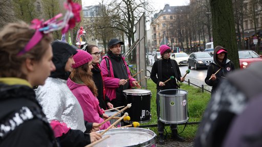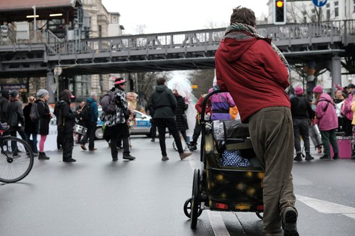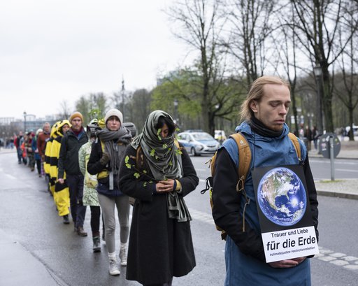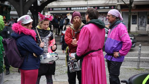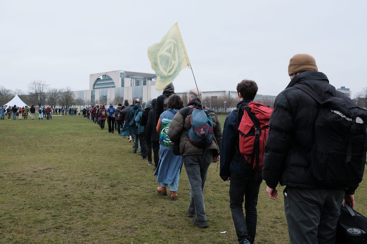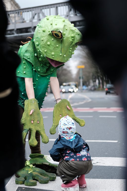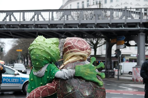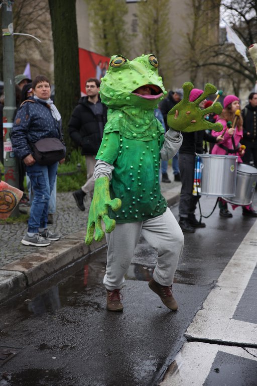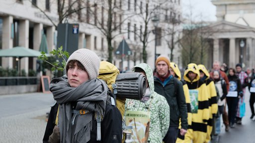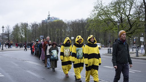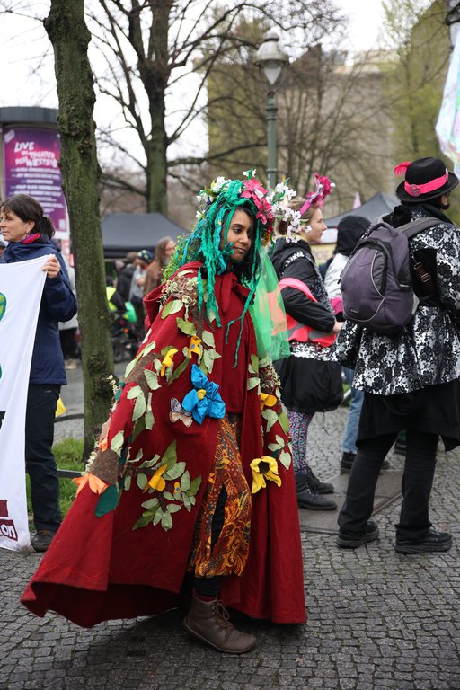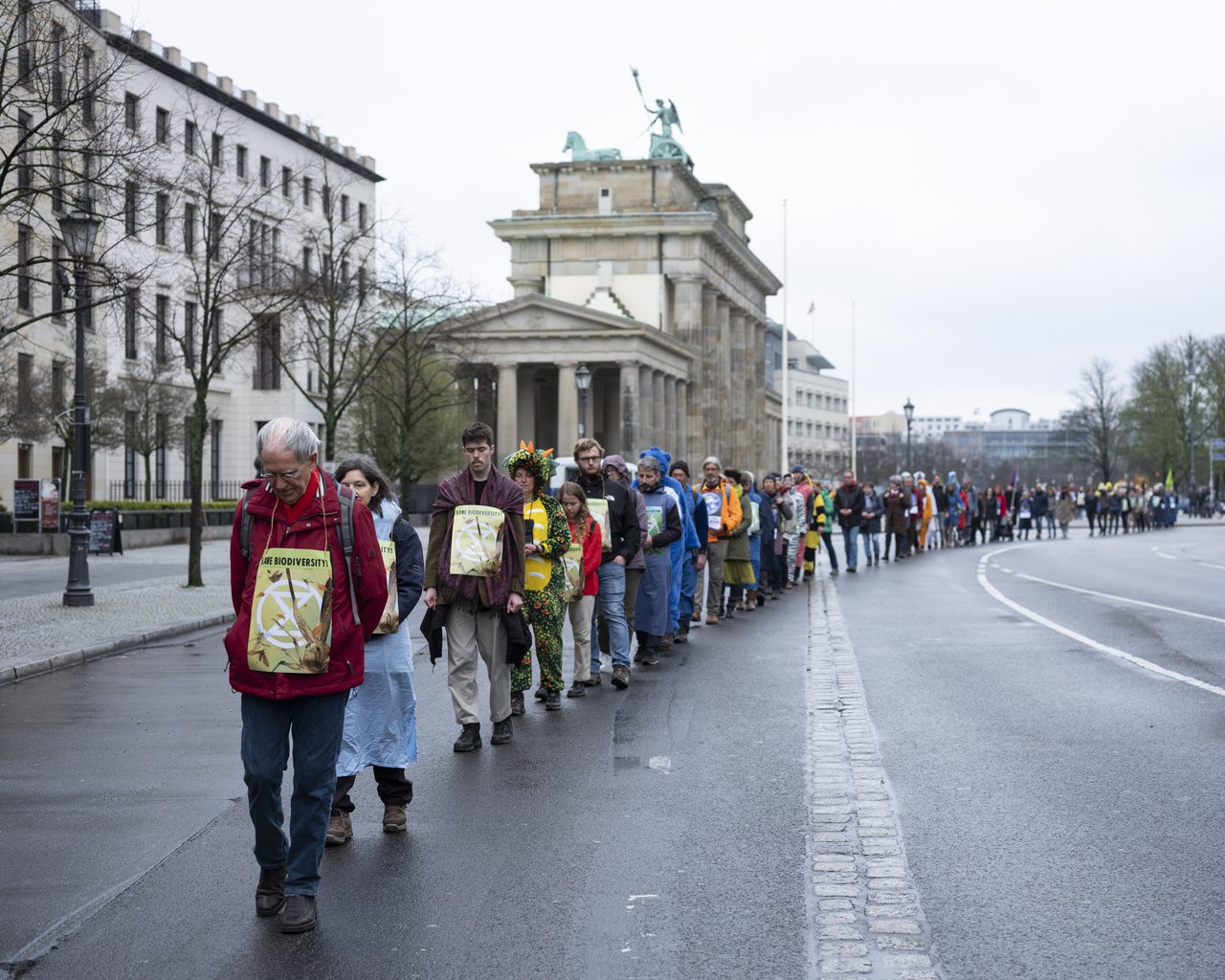Bei einer angemeldeten Aktion ging es in sehr langsamen, achtsamen Schritten vom Brandenburger Tor zur Wiese vor dem Bundestag. In bunten Gewändern und teilweise Tierkostümen möchte die Gruppe auf das Artensterben aufmerksam machen.