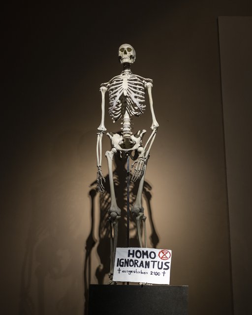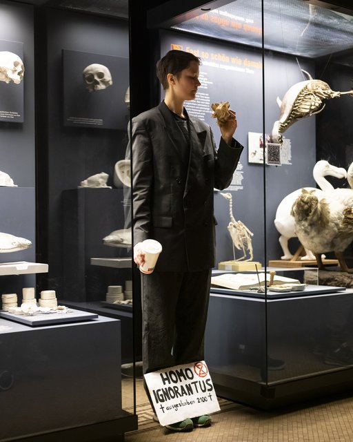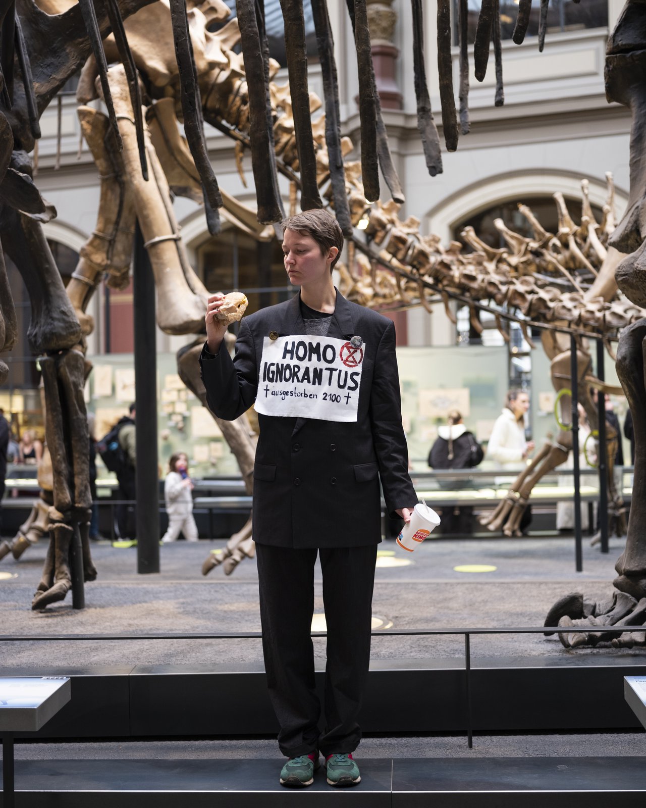 Mit Hamburger und Softdrink ausgestattet ist der vermeintlich moderne Mensch als Exponat heute kurzweilig ins Naturkundemuseum eingezogen und hat sich relativ nahtlos unter bereits ausgestorbene Arten gemischt. Auf seinem Infoschild steht "HOMO IGNORANTUS - ausgestorben 2100".