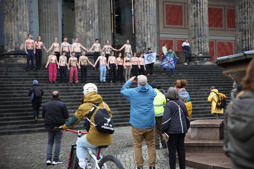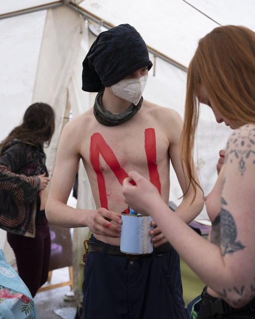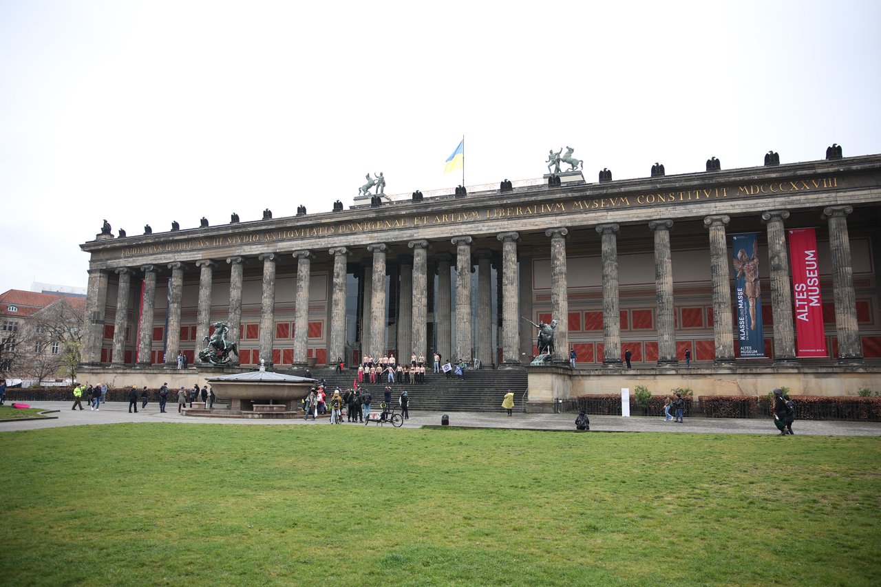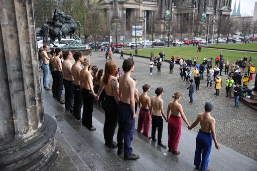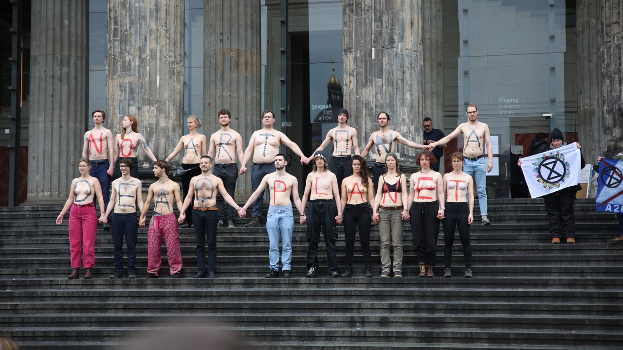 Kurz nach Mittag stehen dann 18 Menschen oberkörperfrei vor dem alten Museum. Unter den mächtigen Säulen, über denen auf Lateinisch ein Hinweis auf deren Erbauer sowie „zum Studium der Altertümer jeder Art sowie der freien Künste“ steht, tragen sie jeweils einen Buchstaben auf ihrem Körper. Zusammen bilden sie den Satz NO ART ON A DEAD PLANET und machen deutlich: Wir riskieren, alles zu verlieren. Berlin als Kulturmetropole. Der ganze Glanz und Dreck, wertlos ohne Betrachterinnen und Betrachter wenn wir Kipppunkte reißen und Folgen der Klimakatastrophe nehmen, was uns lieb und teuer ist.