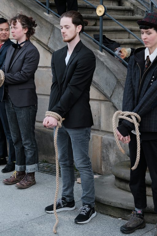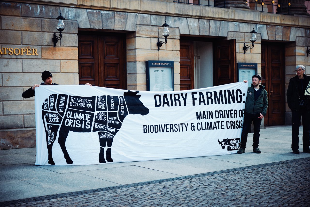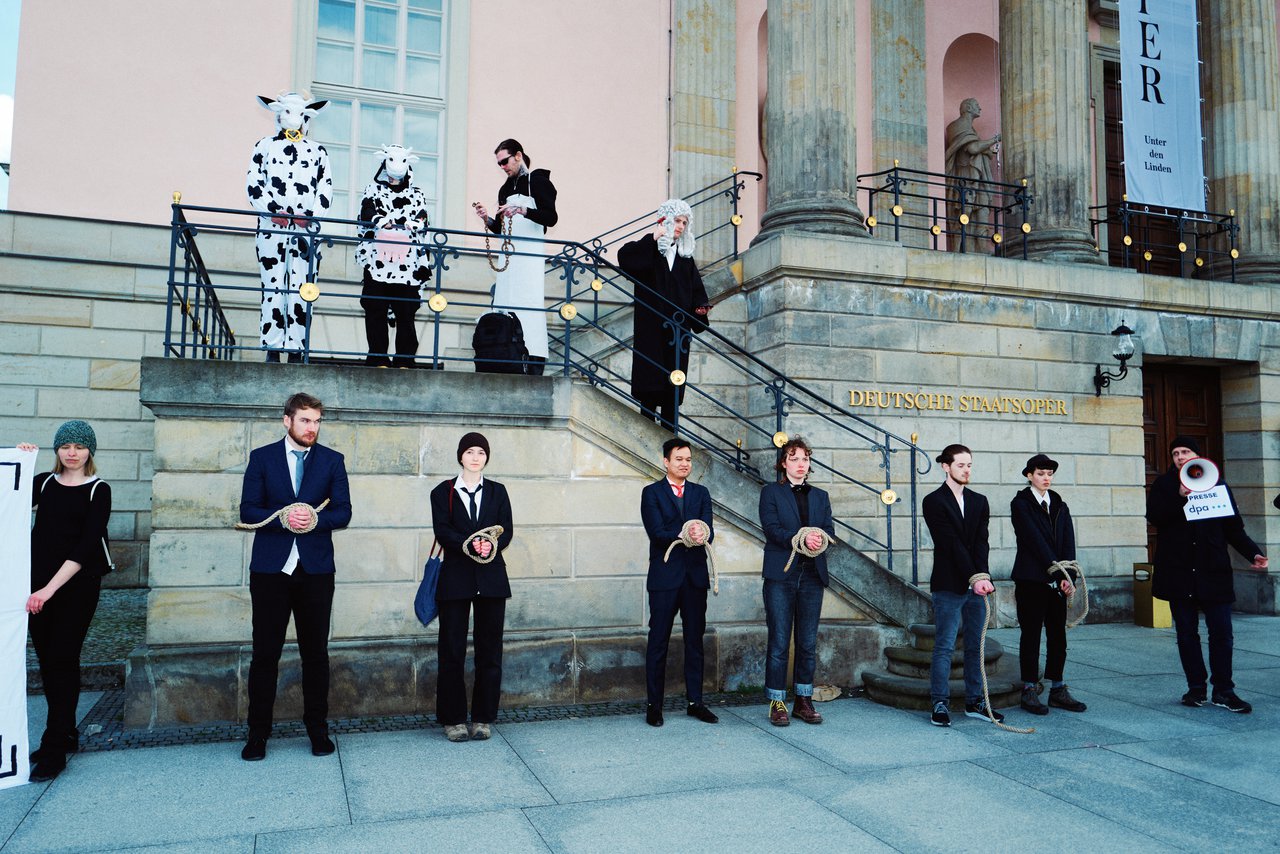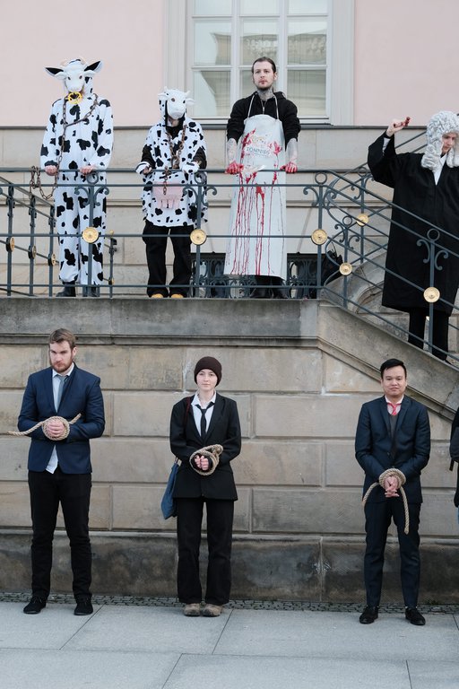Am späten Nachmittag gab es an der Deutschen Staatsoper von Animal Rebellion noch eine Vorschau auf einen fiktiven Gerichtsprozess am nächsten Tag, bei dem Angeklagte der Tierindustrie der Zerstörung an Tier- und Pflanzenwelt schuldig gesprochen werden.