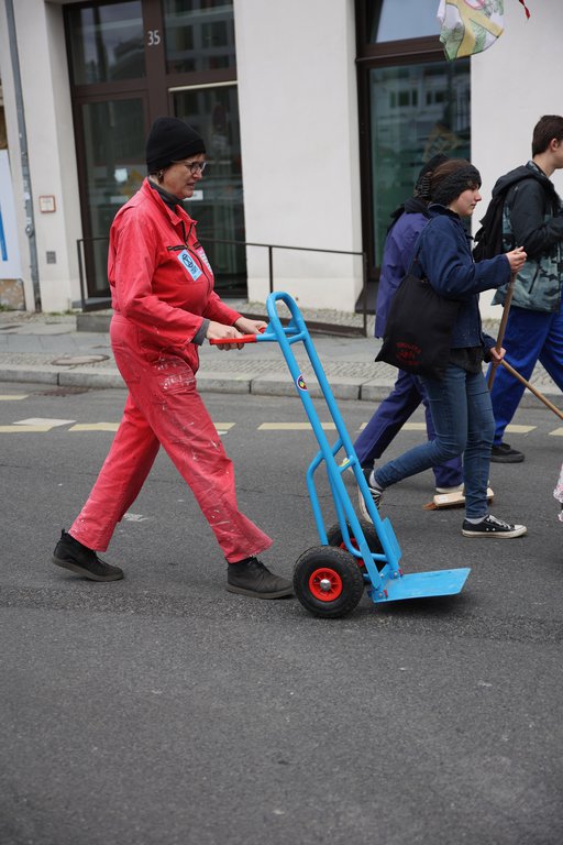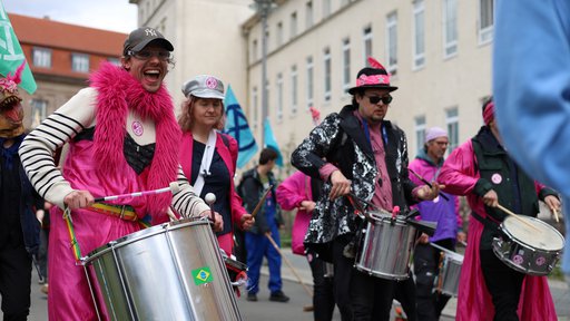 Hinter den Superreichen und der fossilen Lobby kehrte der Pöbel hinterher. Mit den Kundgebungen an verschiedenen Streckenabschnitten in Form von Danksagungen an Lobby-Verbände und fossile Energie-Konzerne konnten die Handwerkerinnen und Handwerker nicht viel anfangen. Bei den ironischen Redebeiträgen musste die ein oder andere Polizeikraft dafür schmunzeln. Zwischendurch hielten die XR Drummers die Menge bei Laune.