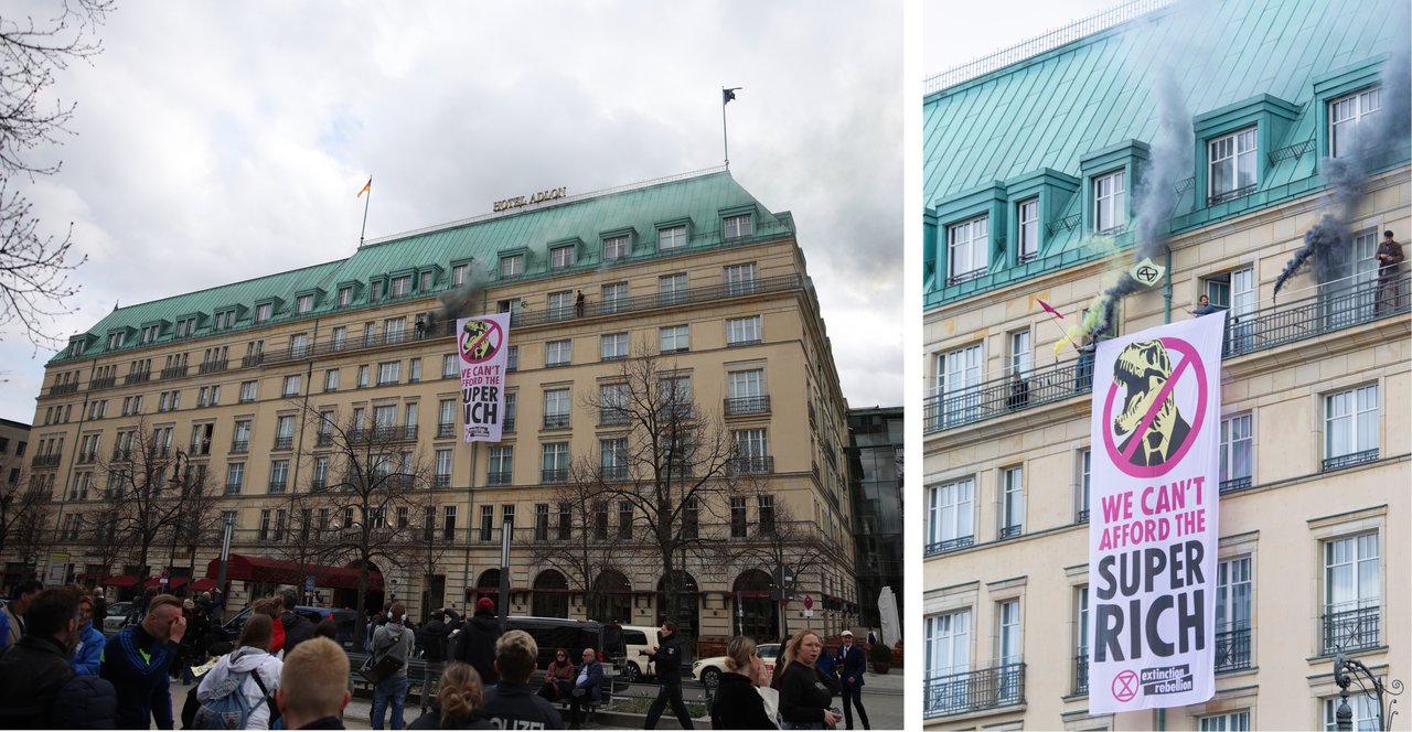 Doch plötzlich zerschneidet ein schriller Alarm die Sektempfang-Atmosphäre auf dem Platz. Rauch steigt von einem Balkon des Hotel Adlon auf, eine der teuersten Adressen Berlins. Ein 12 Meter langer Banner wird entrollt "Wir können uns die Superreichen nicht leisten" steht unter einem Dino mit Krawatte.