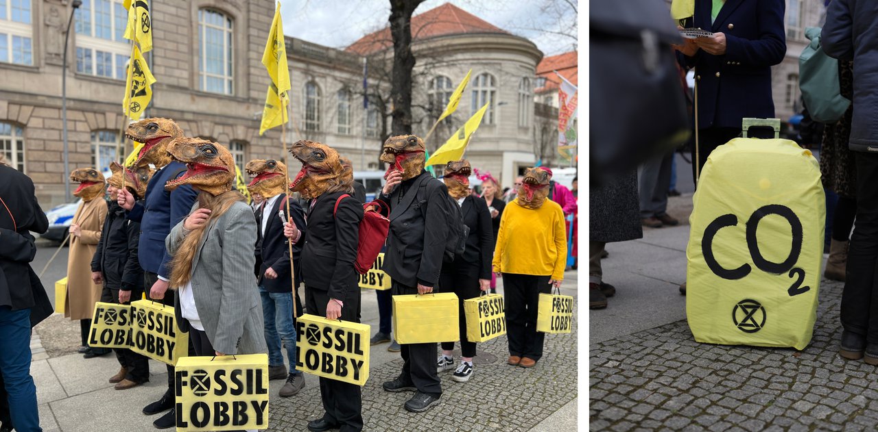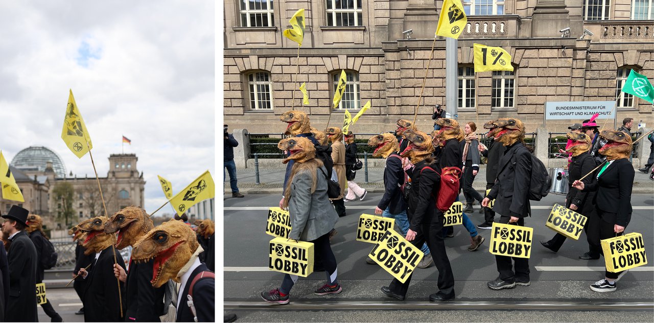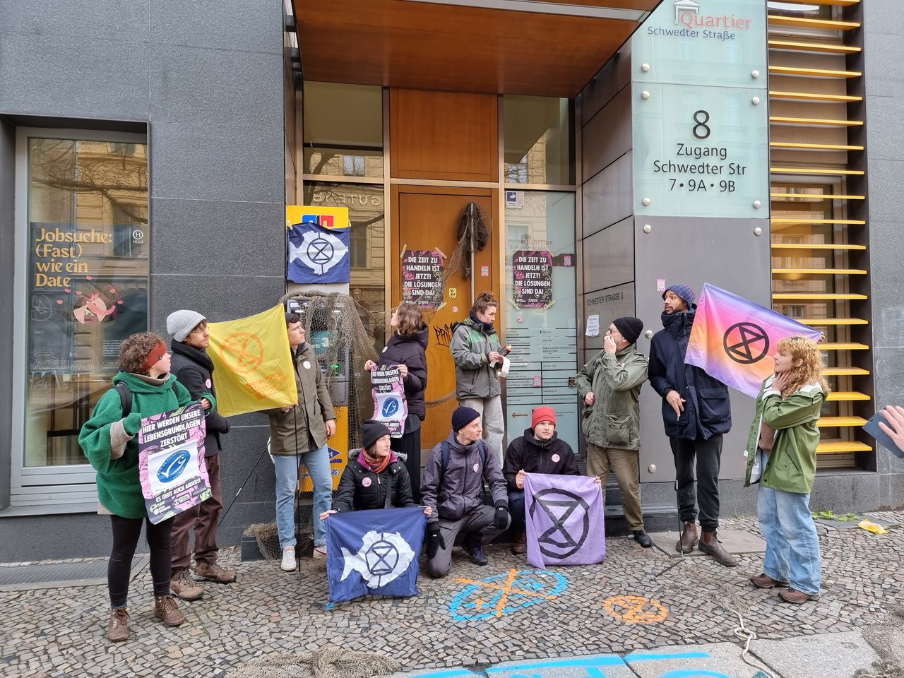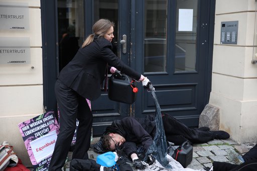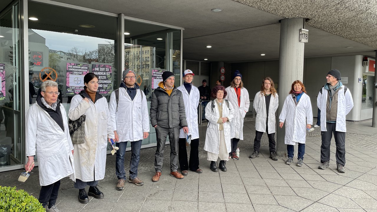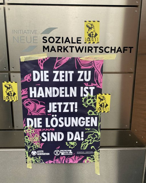 Mit Plakaten, Kunst-Öl und Requisiten sind am frühen Morgen etwa 20 Gruppen zu verschiedenen Konzernen, Lobbygruppen und Parteien gezogen. Auf den Plakaten, die an die Eingänge geklebt wurden, stand "Hier werden unsere Lebensgrundlagen zerstört". Mit dabei waren auch Gruppen der Scientist Rebellion und LetzteGeneration. Wir möchten mit der Aktion deutlich machen: Das aktuelle System verursacht das sechste große Massensterben und zerstört damit empfindliche Nahrungsnetze, von denen wir abhängen. Wir können uns diese Umweltzerstörung durch multinationale Unternehmen und das derzeitige Wirtschaftssystem nicht länger leisten! Wir müssen umdenken und regenerative Systeme aufbauen.