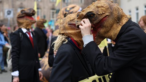Bei einem satirischen Demozug der Superreichen haben wir die fossile Lobby angetroffen. Trotz schlauen Anzügen schien den Dinosauriern nicht bewusst zu sein, wie sehr ihre Art vom Aussterben betroffen ist. Sie machten sich wie gewohnt für niedrige Steuern, mehr Gewinne sowie Öl, Gas und Kohle stark. Sie hatten jede Menge Emissionen im Gepäck. Auch Superreiche waren anwesend, in fantastischen Outfits.