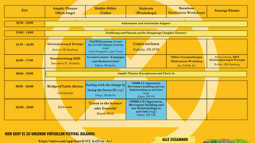 Alles von Workshops, live Musik, der Vorstellung von noch folgenden (digitalen) Aktionen, Räumen der Regenerativen Kultur, Informationsveranstaltungen, konzerten, Kunstausstellungen, Yoga-Einheiten, Lesungen, Diskussionen und Kreativräume