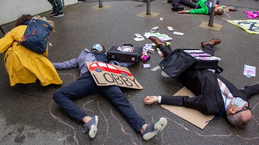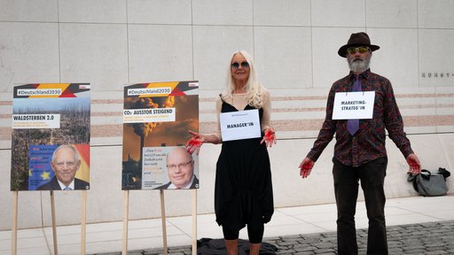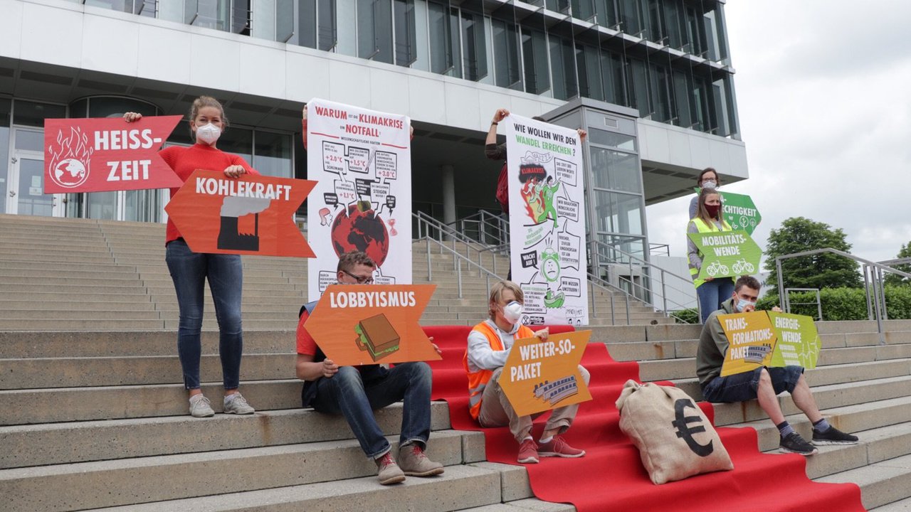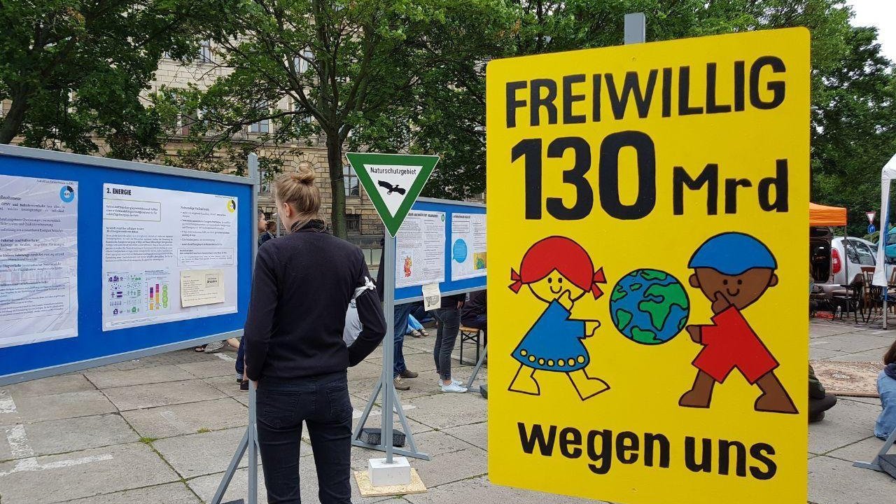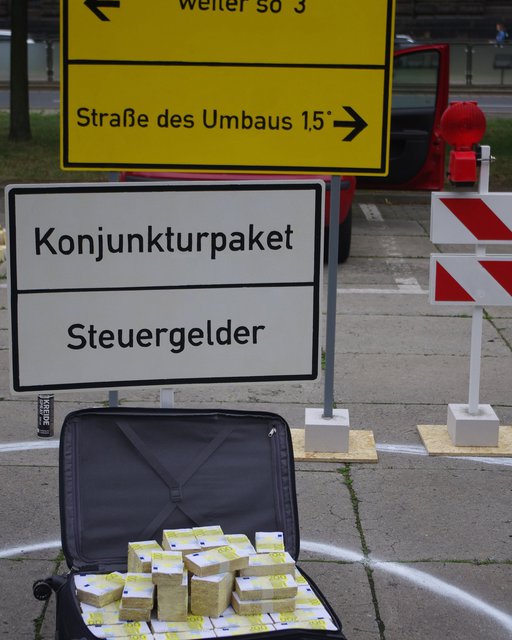 "Nicht Fluggesellschaften und Automobilhersteller sollen Milliardenzuschüsse bekommen, sondern nachhaltige Unternehmen." Zur Veranstaltung gehörten ein Tauziehen inszeniert (Lobbyist:innen gegen Aktivist:innen), Plakate, Musik, Reden von verschiedenen Umweltbewegungen und die Übergabe des "umweltgerechten Finanzplans" von German Zero an das Finanzamt.
