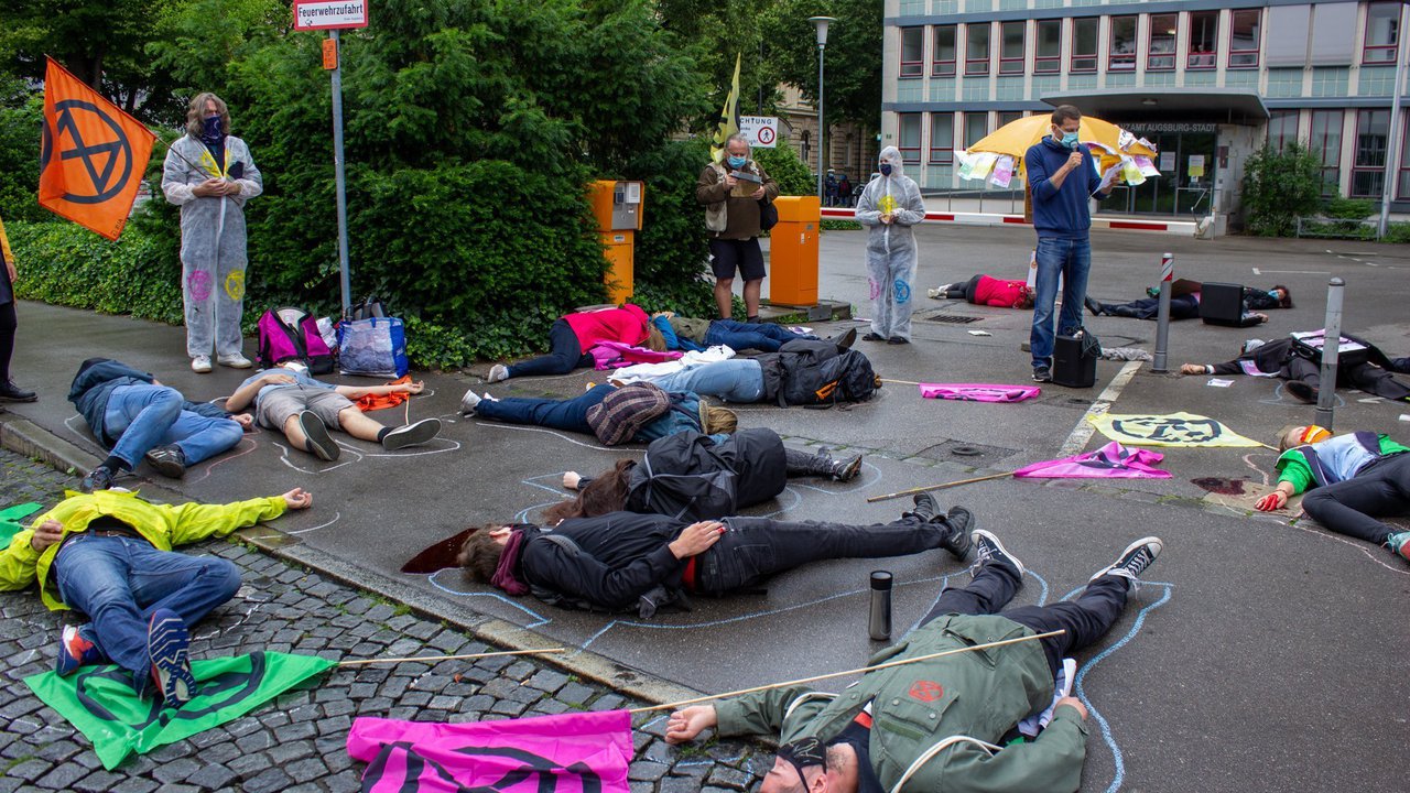 Vor dem Finanzamt Augsburg-Stadt wird eine Steuererklärung verlesen, inklusive Die-In und vorheriger Inszenierung.