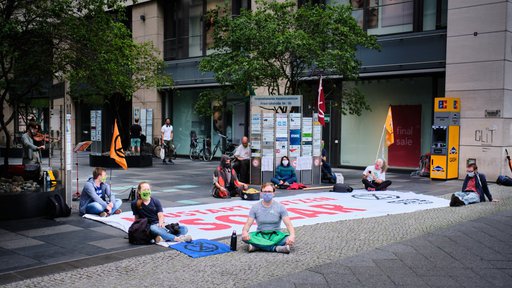 Vor dem Internationalen Handelszentrum an der Friedrichstraße haben etwa 15 Rebell:innen ein Transparent ausgerollt, drei Leute sind angeklebt. In dem Gebäude hat unter anderem der Klimakiller RWE seinen Sitz. Es wird gefordert: „Neustart nutzen - Solar“. Die Zeit aus fossiler Energie auszusteigen ist jetzt!
