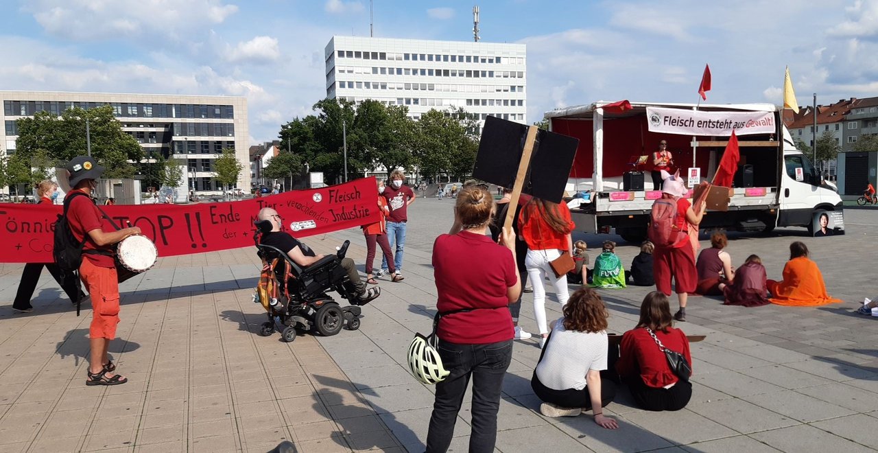 Mit einer friedlichen Kundgebung machte die Bielefelder XR-Gruppe um 16 Uhr auf dem Alten Markt auf die "Tier-, Menschen- und Zukunftsverachtenden Umständen" der industriellen Fleischindustrie aufmerksam. Mehr als 600 Menschen haben sich im Umfeld des Fleischkonzerns Tönnies in Rheda-Wiedenbrück mit dem Corona-Virus infiziert. Insgesamt 7.000 Menschen mussten in Quarantäne. Schulen und Kitas im Kreis Gütersloh werden geschlossen.