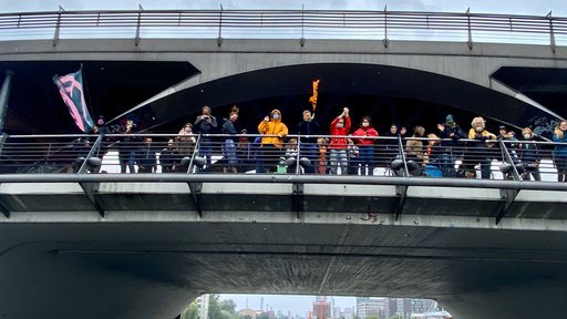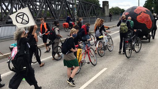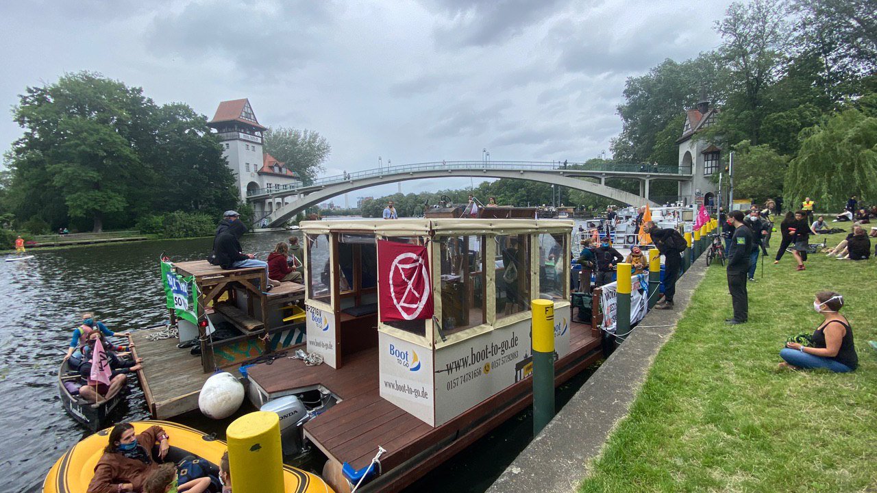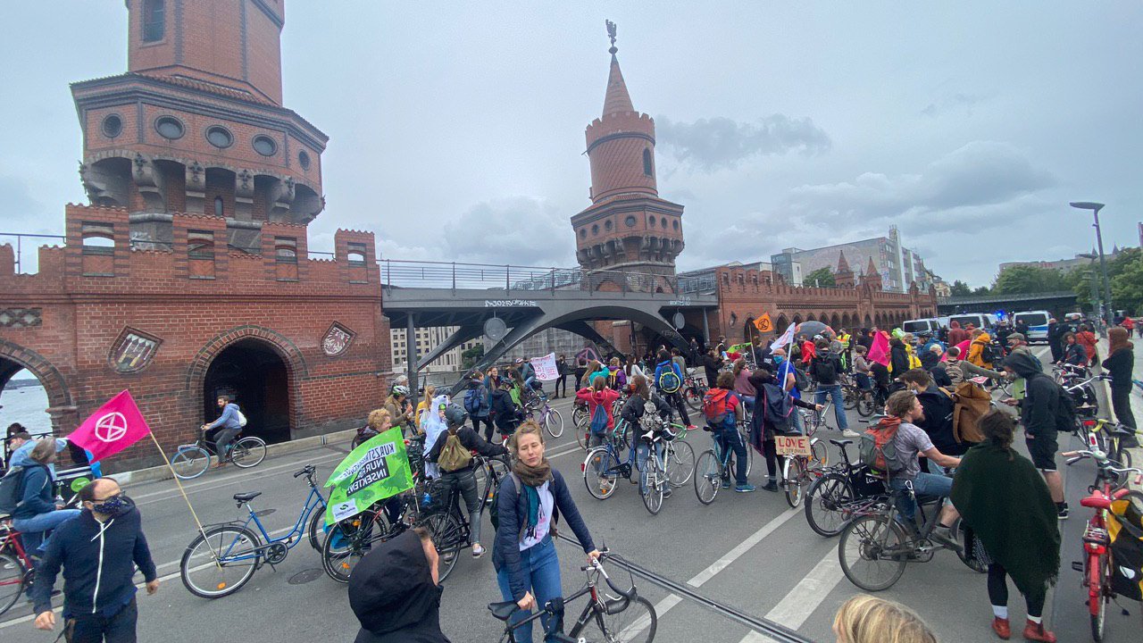 Aktivisten der Extinction Rebellion versammelten sich am Samstag mit Rädern auf der Oberbaumbrücke. Auch einige Boote der Gruppe waren im Einsatz.