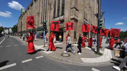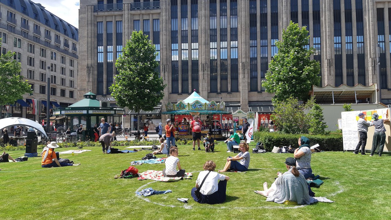 Um zwölf Uhr veranstaltete XR NRW auf dem Corneliusplatz eine Offene Versammlung. Eröffnet wurde sie mit einer Performance der Red Rebels.