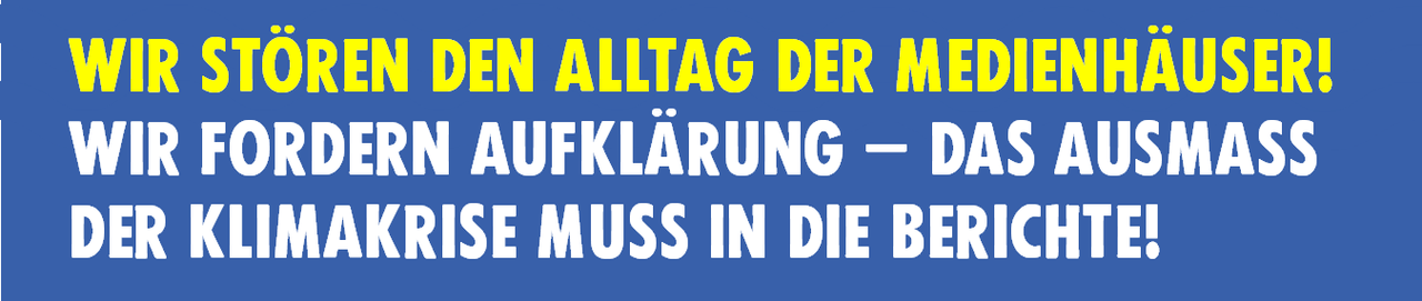 Am Montagmorgen machen Aktivist:innen auf das Problem aufmerksam, indem sie kurz den Verkehr unterbrechen und anschließend die Zufahrt zum betreffenden Medienhaus blockieren. Begleitet von einem dystopischen Schauspiel, welches Formaten wie der tagesschau durch Überspitzung aufzeigt, dass dringend der Krisenmodus angeschaltet werden muss.