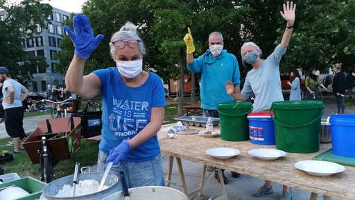 Die Demonstrationszüge The sea are rising - so are we starten gegen 15:30 vor den jeweiligen Parteizentralen der CDU und SPD und treffen sich zu einer Kundgebung am Potsdamer Platz. Mit Reden, Theater und Musik werden Passant:innen eingebunden und mit ins Gespräch genommen. Die letzte Station ist am Brandenburger Tor mit einer Transformation der Teilnehmer rund ums Thema Wasser. Rebell:innen bringen blaue Tücher, Pflanzen, Verkleidung und Dekoration mit. Wasser ist sowohl essentiell wie bedrohlich, Wellen stehen für das Leben aber auch den ansteigenden Meeresspiegel.