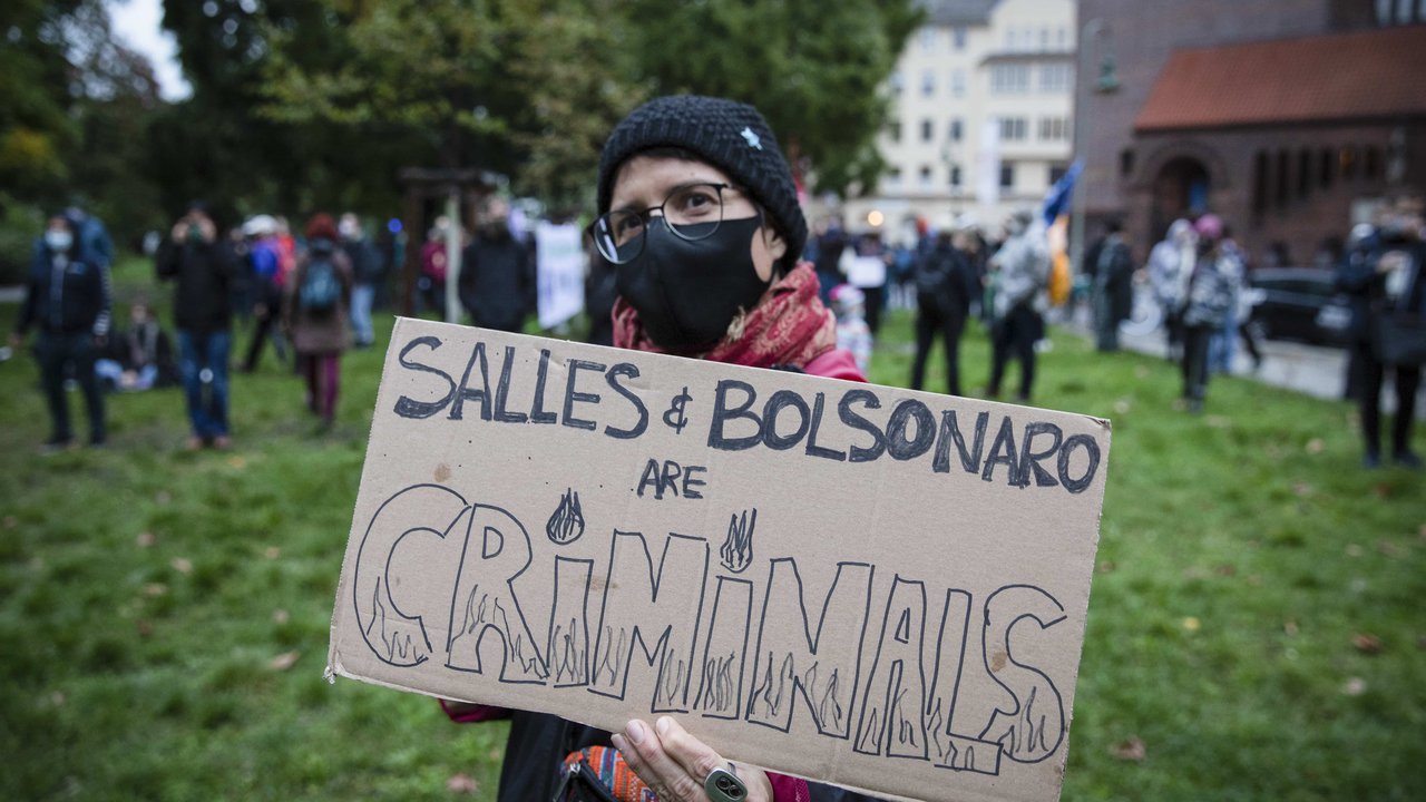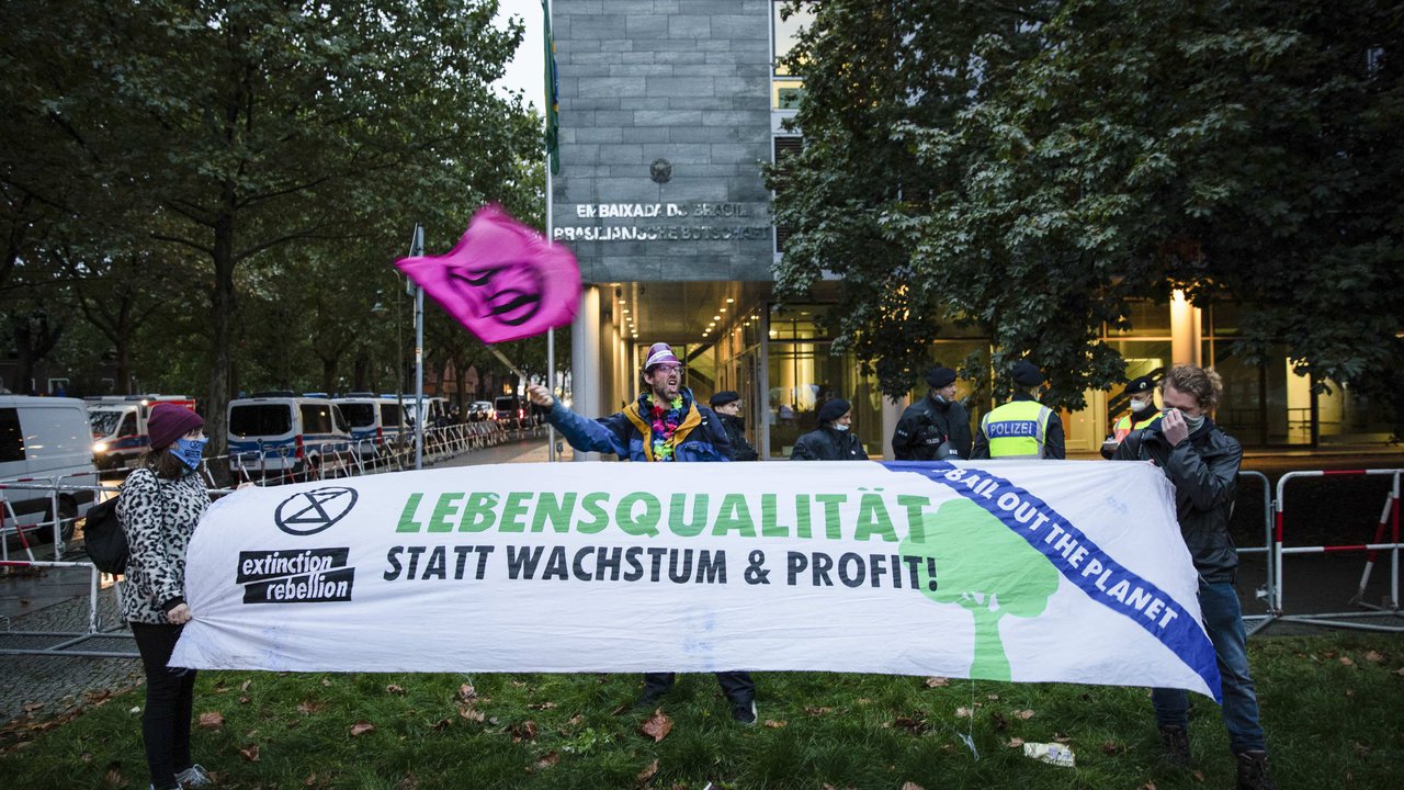 Von 18:00 bis 19:30 Uhr findet die angemeldete Demonstration "Spot on Brasil" vor der brasilianischen Botschaft am Märkischen Platz statt. In der Kundgebung wird thematisiert, dass die Rechte indigener Völker beim Klimaschutz respektiert werden müssen. Der Protest richtet sich gegen das Morden an Indigenen Menschen und gegen den Ökozid an Amazonas und Pantanal. Eine Aktivistin von XR Latin America meldet sich angesichts eines Banners ermordeter Aktivist:innen: "Thank you for doing this. I'm in tears."