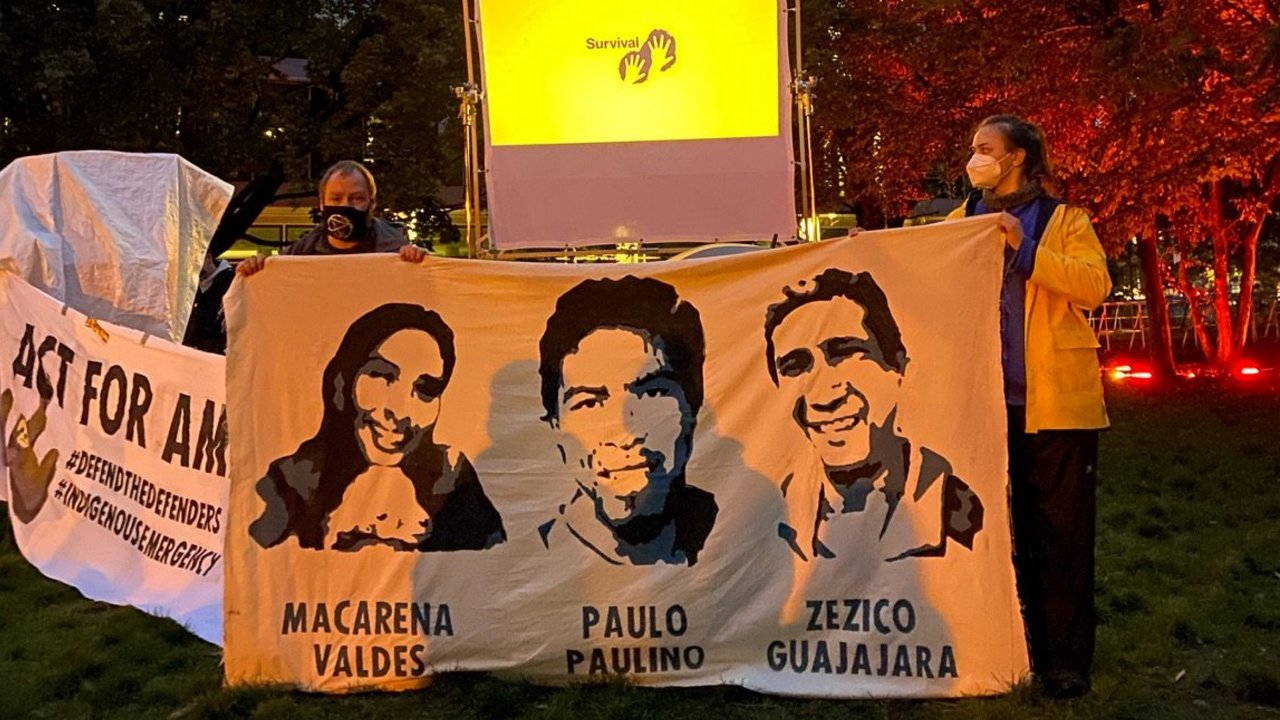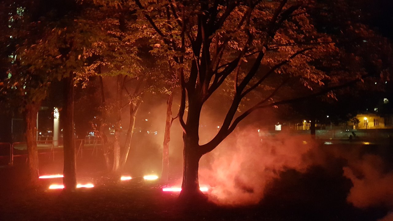 In einer Filmvorführung kommen Vertreter:innen indigener Völker in Brasilien zu Wort. Zum Abschluss wird eine gemeinschaftliche Kunstaktion zelebriert. Dazu rufen die Anwesenden ein zuvor bereitgestelltes Video lodernder Flammen auf und halten ihre Smartphones in die Höhe.