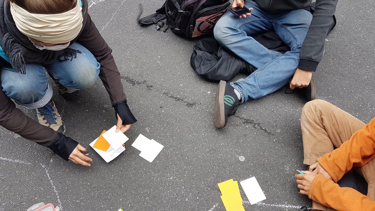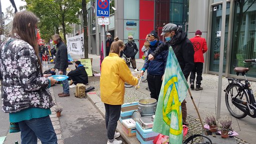 Um die Klimakrise zu bewältigen, fordert Extinction Rebellion auch mehr Demokratie. In einer Bürger:innenversammlung soll ein repräsentativer Schnitt der Bevölkerung mit der Unterstützung von Expert:innen Lösungen für die Klimakrise erarbeiten. Die Zeit in der Blockade wird für eine Trockenübung in Form einer Rebell:innenversammlung genutzt, um während des Abschluss der Rebellion Wave am Freitag gemeinsam in einem größeren Kreis von Aktiven zu reflektieren. Als gegen 13:20 Uhr eine Essenslieferung eintrifft, sind bereits alle Bezugsgruppen fleißig am diskutieren und Feedback auf Karteikärtchen sammeln.