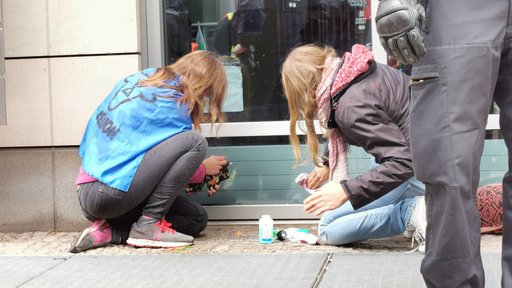Gegen 11:10 Uhr kommt die erste, um 11:20 Uhr die letzte Durchsage der Polizei, dass alle Personen auf dem Bürgersteig, insbesondere vor dem Haupteingang der DEGES jetzt geräumt werden. Bis 11:40 Uhr sind alle angeklebten Rebell:innen geräumt. Im Nachgang säubern Rebell:innen die Scheiben wieder von Kleberückständen.