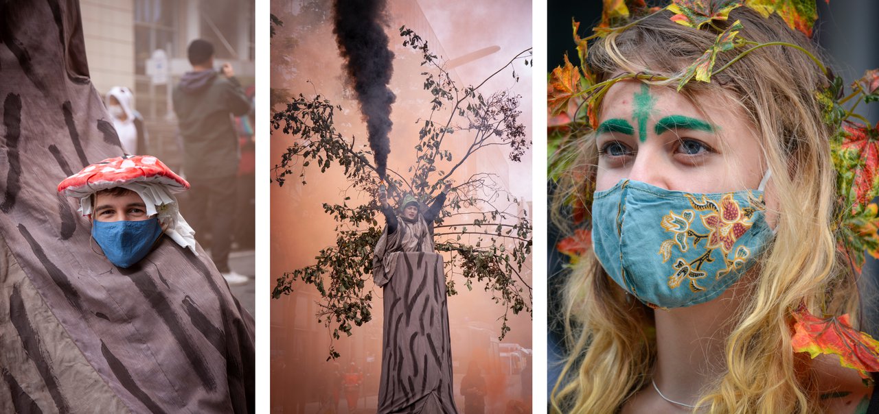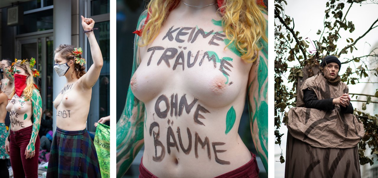 In mehreren Reden erläutern Rebell:innen die Zusammenhänge rund um den Lückenschluss der A49. Nach Jahrzehnten erfolgloser Trassensuche bedroht die aktuelle Planung nun nicht nur wertvolle Wälder, sondern auch ein Trinkwasserreservoir des Rhein-Main-Gebiets. Bisherige in Frage kommende Anrainergemeinden, allen voran Marburg, zu der der Lückenschluss geographisch am logischsten erfolgt wäre, konnten sich erfolgreich wehren. Seit einem Jahr besetzen Aktivist:innen mit Baumhäusern den Dannenröder Wald, um auch auf eine gescheiterte Verkehrswende hinzuweisen. Gegen 10:30 Uhr wird ein brennender Wald mit Rauchfackeln inszeniert.