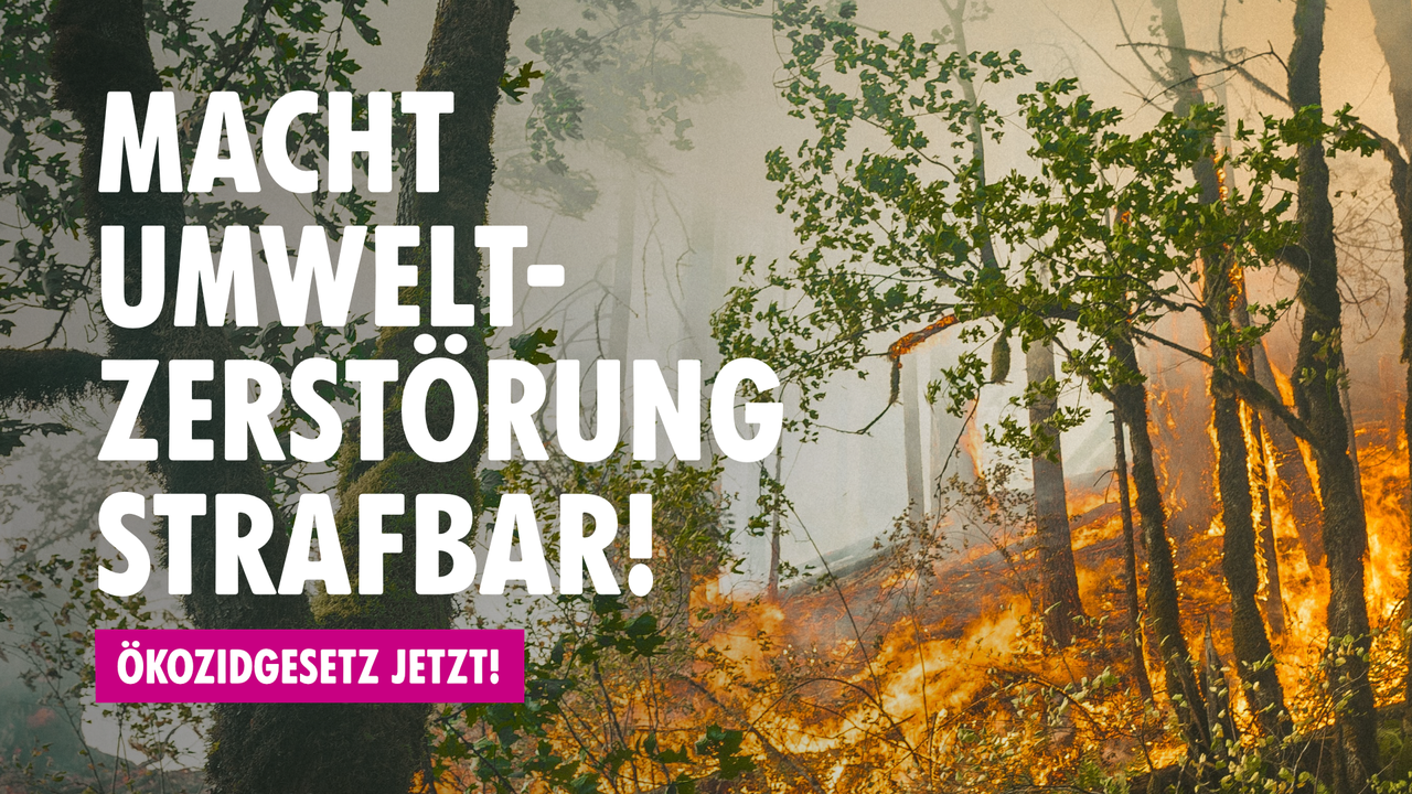 Aber Verbrechen an unseren Ökosystemen, an unseren natürlichen Lebensgrundlagen, an unserem Klima bleiben derzeit noch weitestgehend unbestraft, obwohl sie die Welt als Ganzes berühren. Das muss sich ändern. Wir fordern die Einführung des Straftatbestandes des Ökozids sowohl in das deutsche Strafgesetzbuch als auch auf internationaler Ebene. Wir wollen Umwelt- und Klimazerstörer wirksam vor Gericht bringen!