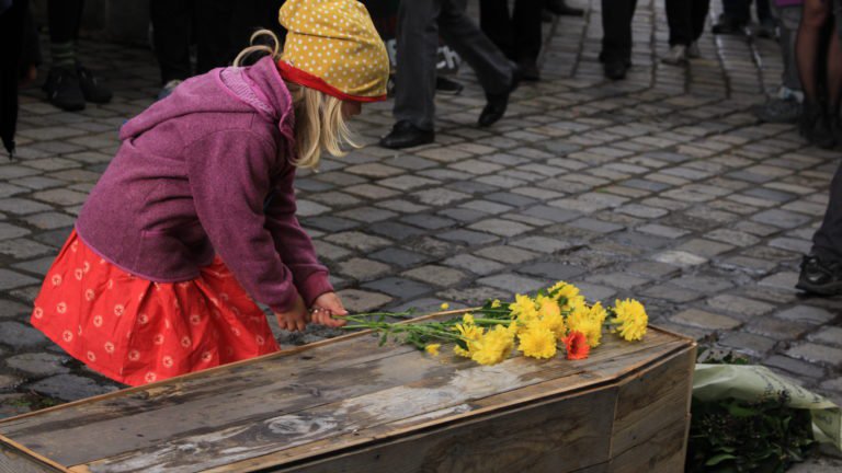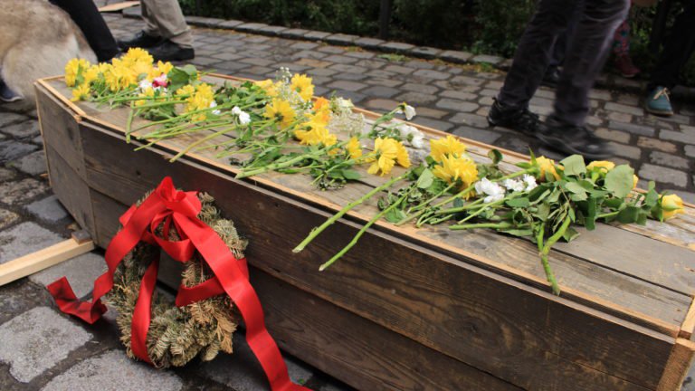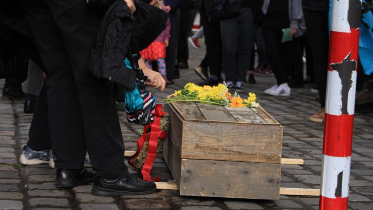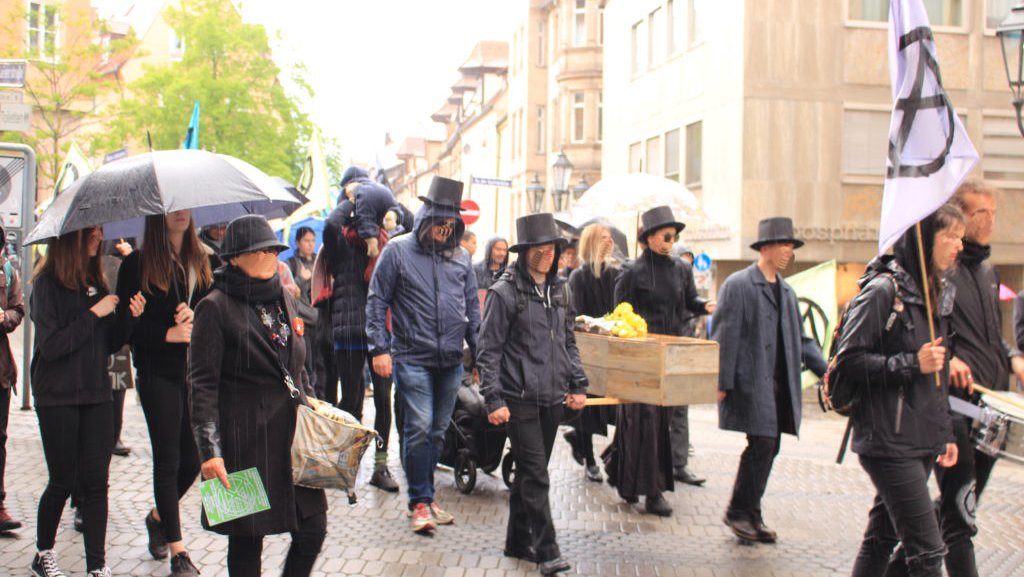 Am Samstag war eine Aktion, organisiert von der Münchner und Nürnberger XR-Gruppe, mit Teilnehmer*innen von XR-Regensburg, Fridays for future, dem BUND, parents for future, den Bluepingus und vielen anderen Menschen, nicht nur aus Nürnberg, sondern auch aus Würzburg, Passau und dem Allgäu. Eine Aktion, bei der ein Sarg quer durch die Innenstadt getragen wurde. Zur Erinnerung an die Tierarten, die bereits endgültig aus dem Universum verschwunden sind. Ganz ohne Parolen, ohne Lärm. Eine einzelne Trommel an der Spitze des Zuges. Ein paar bunte Fahnen mit dem Logo von XR – und am Rand des Zuges ein Dutzend freundliche Menschen, die den Passanten einen Flyer in die Hand drückten, um was es geht.