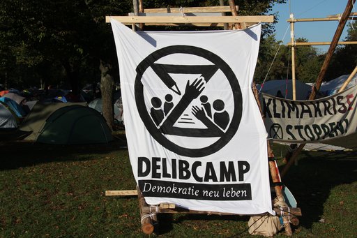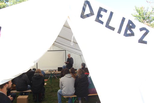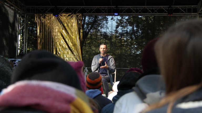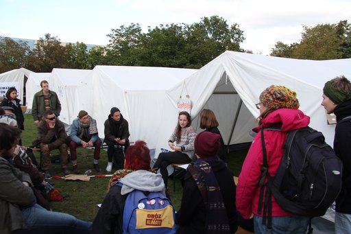 Die Campteilnehmer:innen wurden heute von strahlendem Sonnenschein geweckt. Die Wiese neben dem Kanzlerinnenamt ist fast vollständig mit Zelten bedeckt und es herrscht eine entspannte Stimmung. Nach dem Frühstück startete das Programm mit einem Vortrag des Kulturphilosophen und Autors Charles Eisenstein, der als ein wichtiger Theoretiker der Occupy-Bewegung gilt.