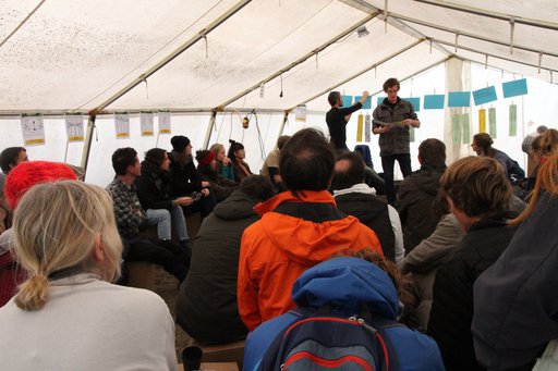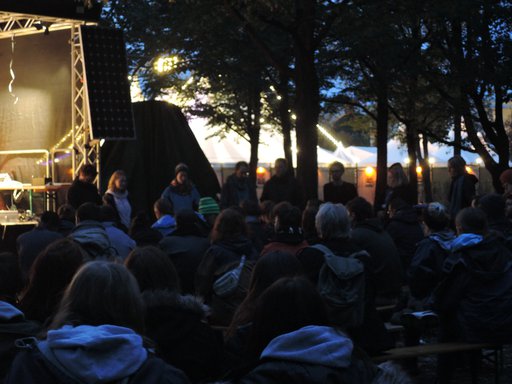 Im Camp geht es weiter mit spannenden Programmpunkten. Zum Beispiel ein Live-Rollenspiel zum Thema G7 im Jahr 2049. Im Familien- und Kinderzelt wird gemalt und mit Kastanien gebastelt.
