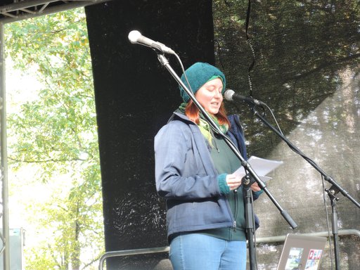 Anschließend betreten Kathrin und Carola die Bühne und sprechen zum Thema Klimagerechtigkeit. Wir erfahren, warum Klimagerechtigkeit viel mit Frauenrechten zu tun hat. So waren unter den Todesopfern des Taifuns auf den Philippinen besonders viele Frauen - weil sie zu Hause darauf warten mussten, dass ihre Männer sie abholen.