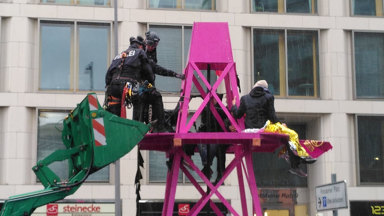 Ein rosa Bohrturm aus Holz ragt aus der Menge. Auf seiner Plattform haben sich Personen fixiert. XR-Fahnen und -Banner ringsum.
