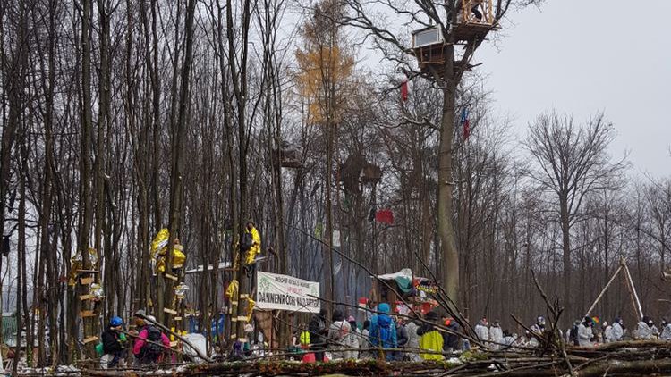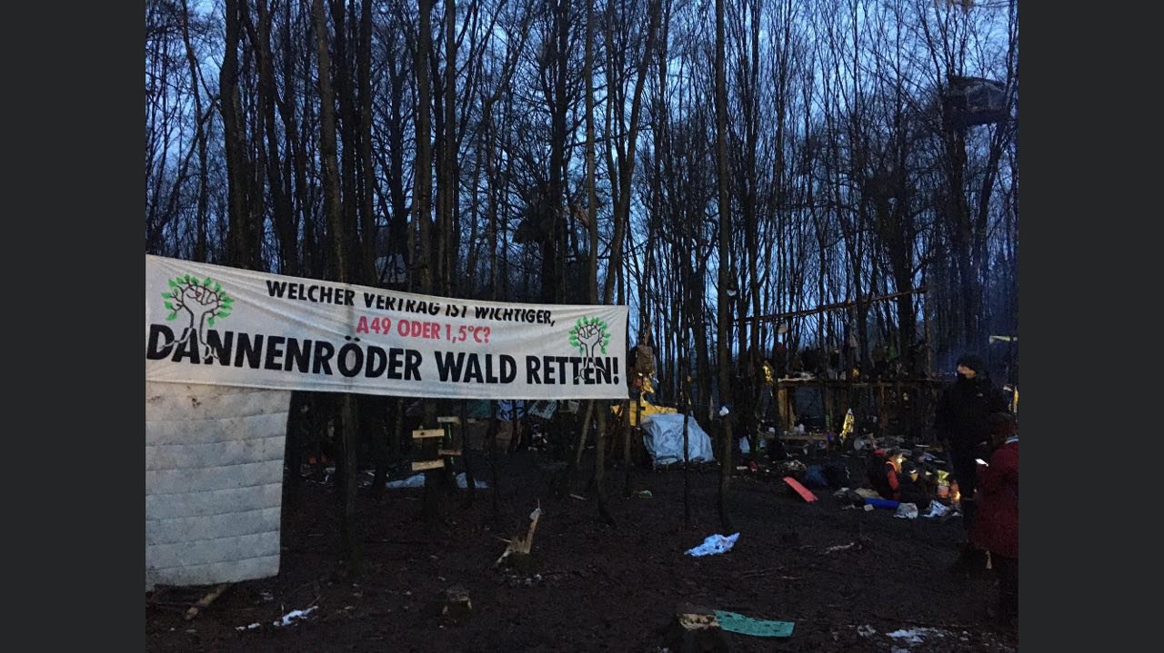 Eine Frau aus der Gegend zeigt auf die Zelte im Wald: „Da wohnen jetzt die jungen Leute, die vorher in den Baumdörfern gelebt haben. Manche sind schon sehr traumatisiert. Mein Sohn ist auch dabei. Er ist Baumpfleger und hat schon auch Angst um seine Freunde.“