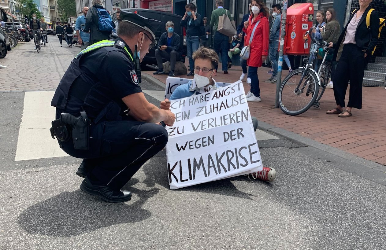 Eine Passantin versuchte noch mit eindringlichem Bitten, mich davon abzuhalten, weil ich mir keinen Schaden zufügen solle. Nachdem der Kleber innerhalb kurzer Zeit getrocknet war, erklärte ich ihr und den teilweise bis zu fünfzig anderen umstehenden Menschen, dass mir in meiner Zukunft wegen der Folgen der Klimakrise sehr wahrscheinlich schlimmere Situationen bevorstehen als ein bisschen Kleber an der Hand. Ich sagte, dass insbesondere Menschen aus dem Globalen Süden schon heute zum Teil tödliche Folgen der Klimakatastrophe erleben.