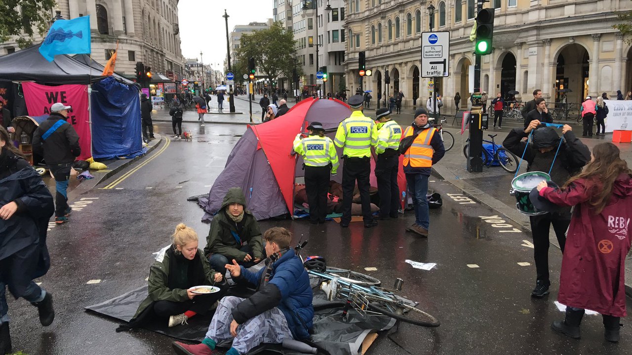12:07 London Trafalgar SquarePolizei fängt an Zelte und Equipment von der Straße zu räumen. (Twitter)