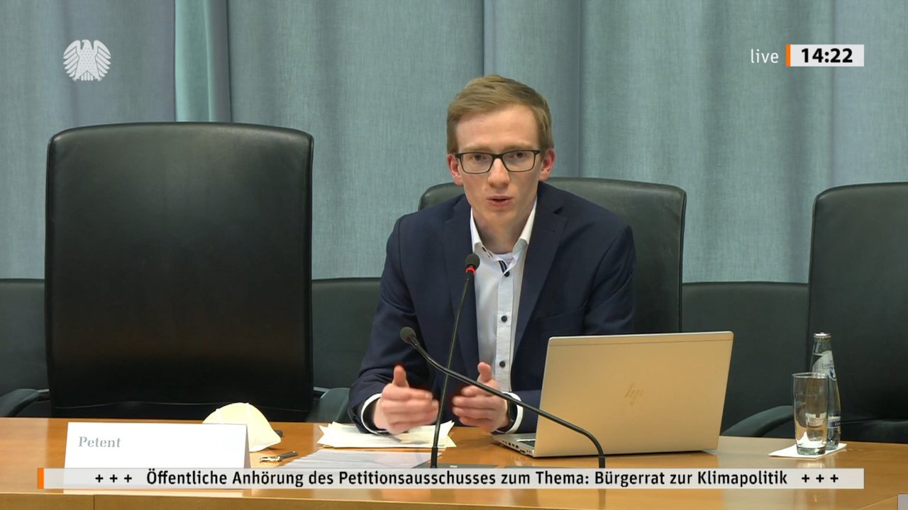 Am 25. Januar fand die öffentliche Anhörung im Petitionsausschuss des Bundestages zur Petition von Klima-Mitbestimmung.JETZT statt, die die Einberufung eines Klima-Bürger:innenrats fordert. Dabei wurde die Position von Klimamitbestimmung.JETZT, die mit knapp 70.000 Unterschriften eine der historisch erfolgreichsten Petitionen ist, rhetorisch stark vertreten. Hier nochmals einen herzlichen Glückwunsch an die Initiator:innen! Doch wie verlief die Anhörung? Und was bedeutet das für unsere dritte Forderung?
