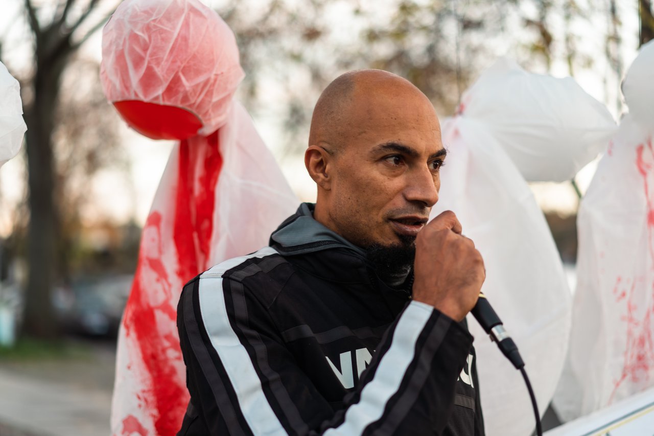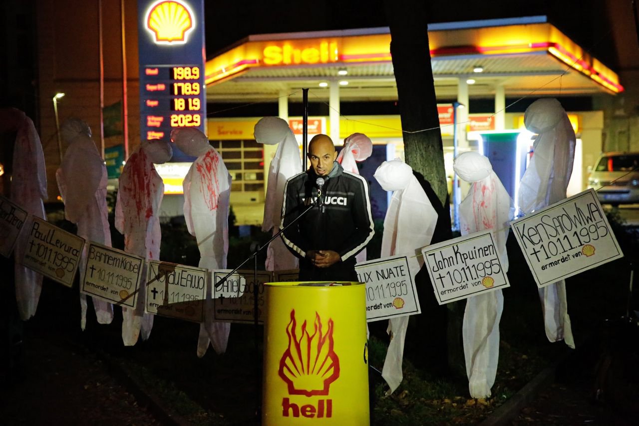 Bei einer Kundgebung zum Gedenken an die Ogoni 9 vor einer Shell-Tankstelle in Berlin-Kreuzberg hielt Olusegun David Agbede am 10. November eine eindrucksvolle Rede. Der Sohn einer Deutschen und eines Nigerianers hat acht Jahre in Nigeria gelebt und lebt jetzt in Berlin, wo er als Sozialbetreuer in einer Unterkunft für Geflüchtete arbeitet.